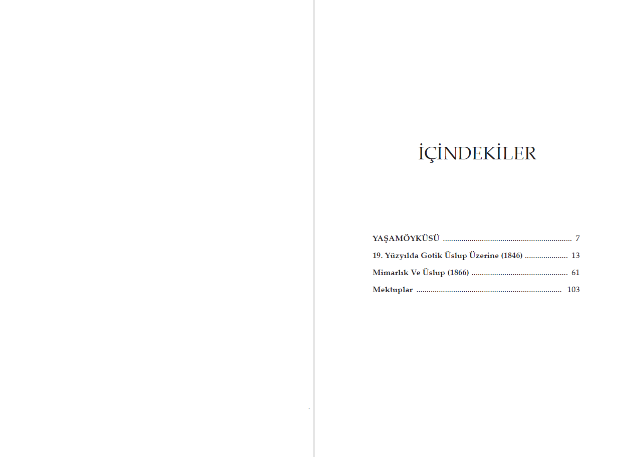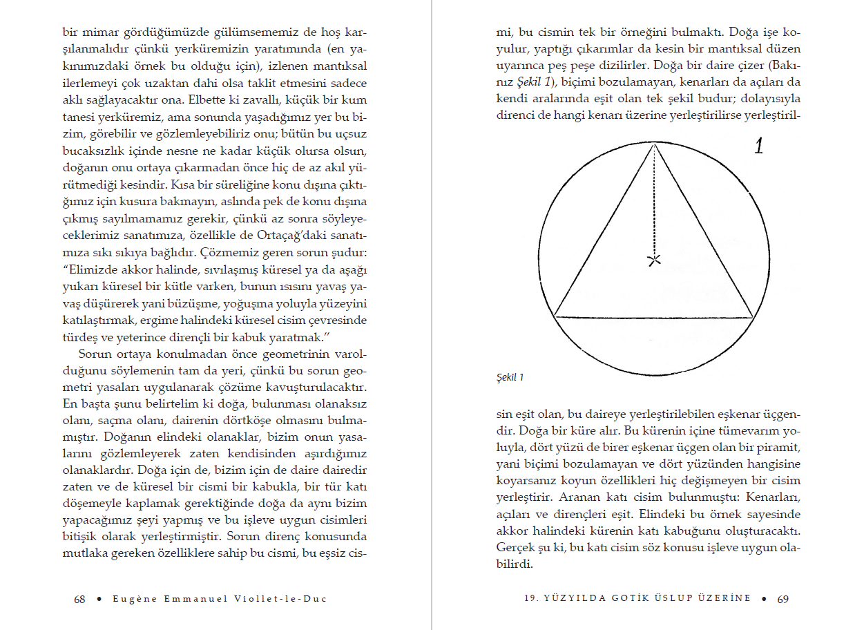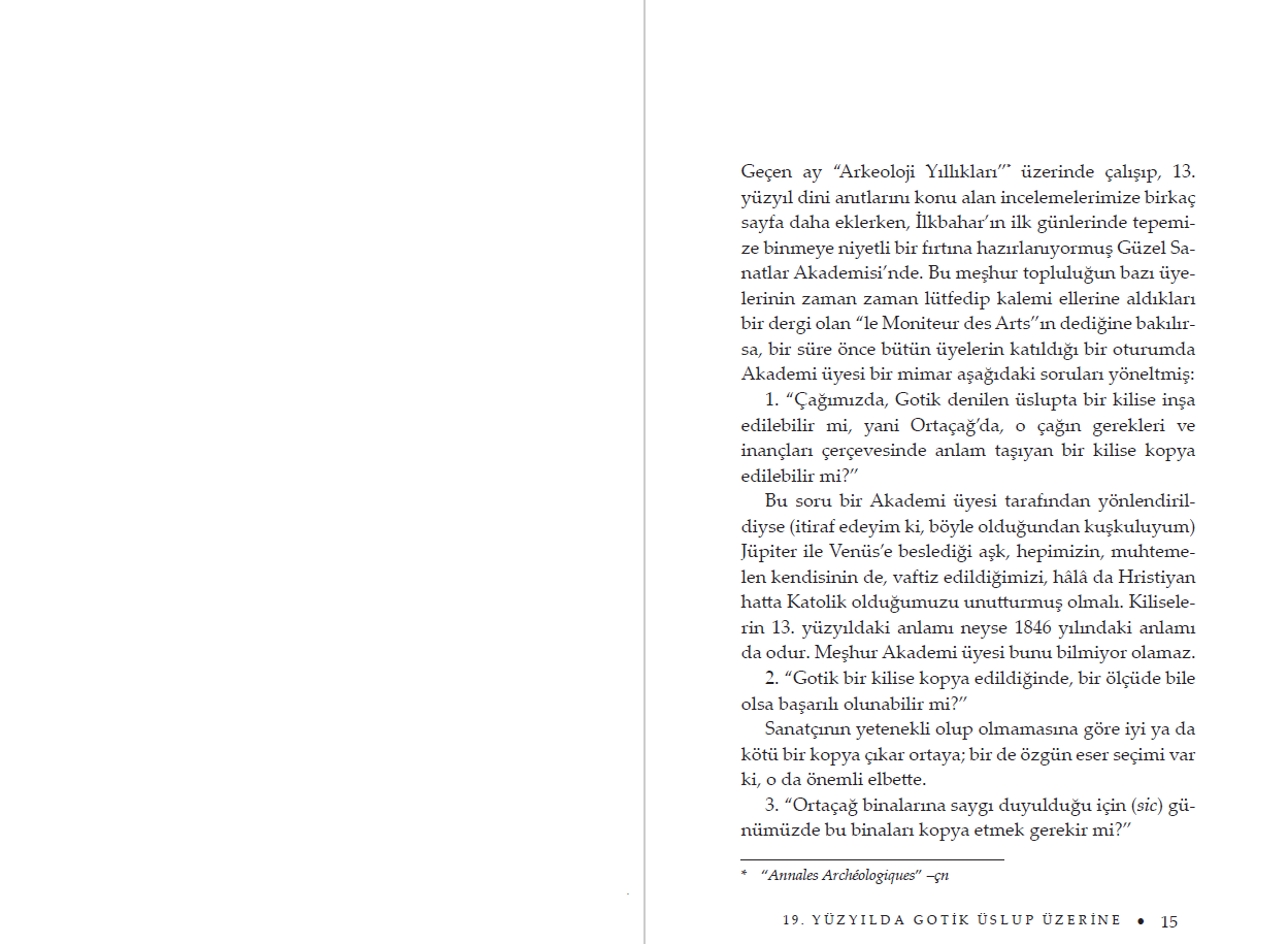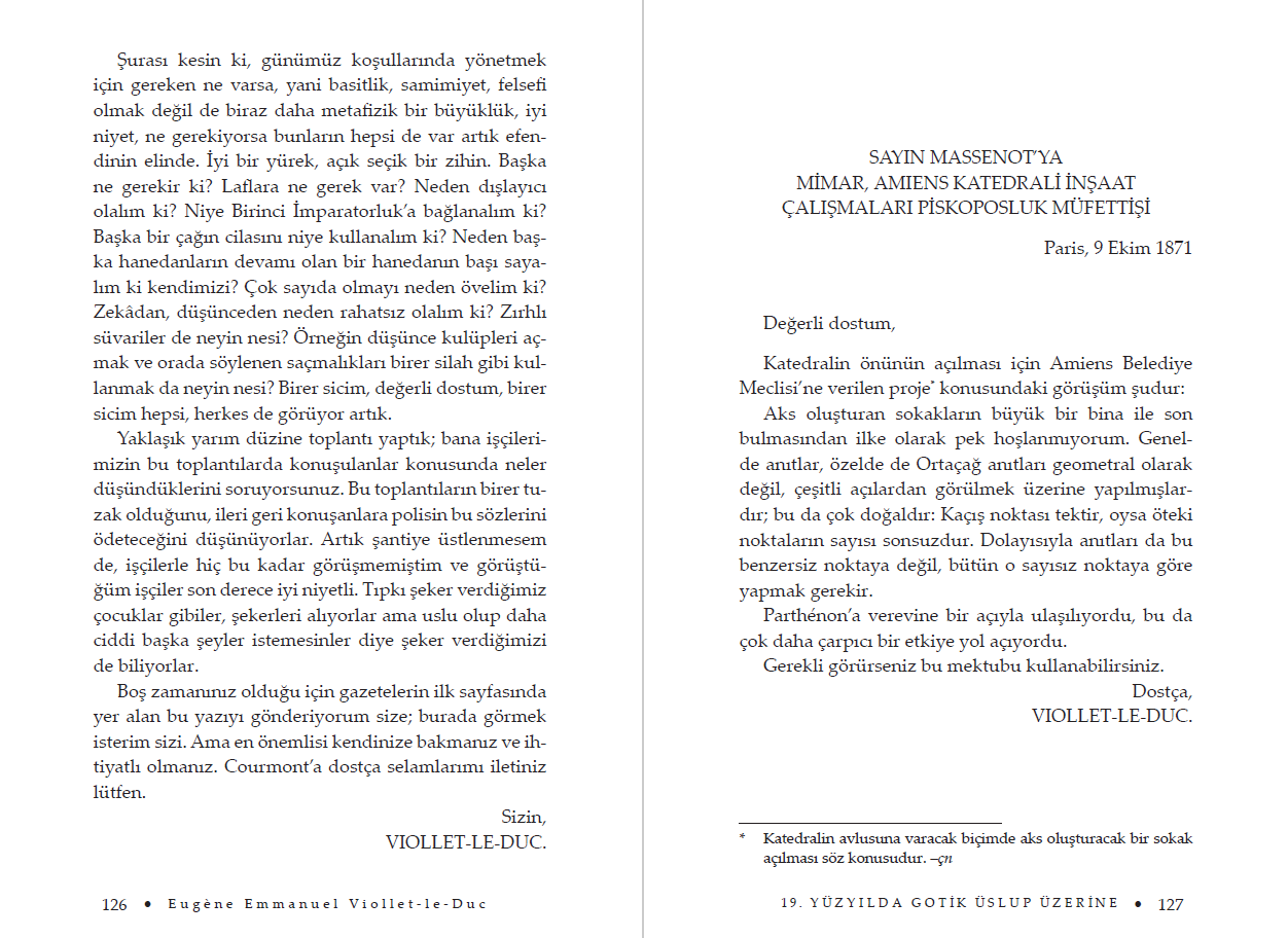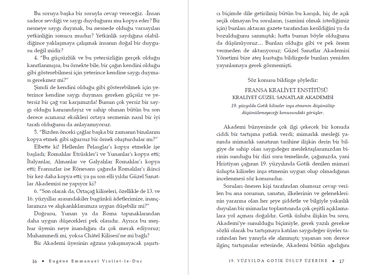Bu derlemeye de adını veren 19. Yüzyılda Gotik Üslup Üzerine adlı yazısı Güzel Sanatlar Akademisi ile yaptığı ünlü bir tartışmadır. Mimarlık Ve Üslup başlıklı bölüm, Viollet-le-Duc'un en kapsamlı çalışması olan Dictionnaire raisonné de l'architecture française du XIe au XVIe siècle içindeki Üslup maddesinin tamamıdır. Genç yaşından beri sık sık uzun seyahatlere çıkan mimarın, yaşamı boyunca yaptığı yazışmalardan bir seçkiyi de Mektuplar başlığı altında biraraya getirdik. "Çağımızda, Gotik denilen üslupta bir kilise inşa edilebilir mi, yani Ortaçağ'da, o çağın gerekleri ve inançları çerçevesinde anlam taşıyan bir kilise kopya edilebilir mi?"
