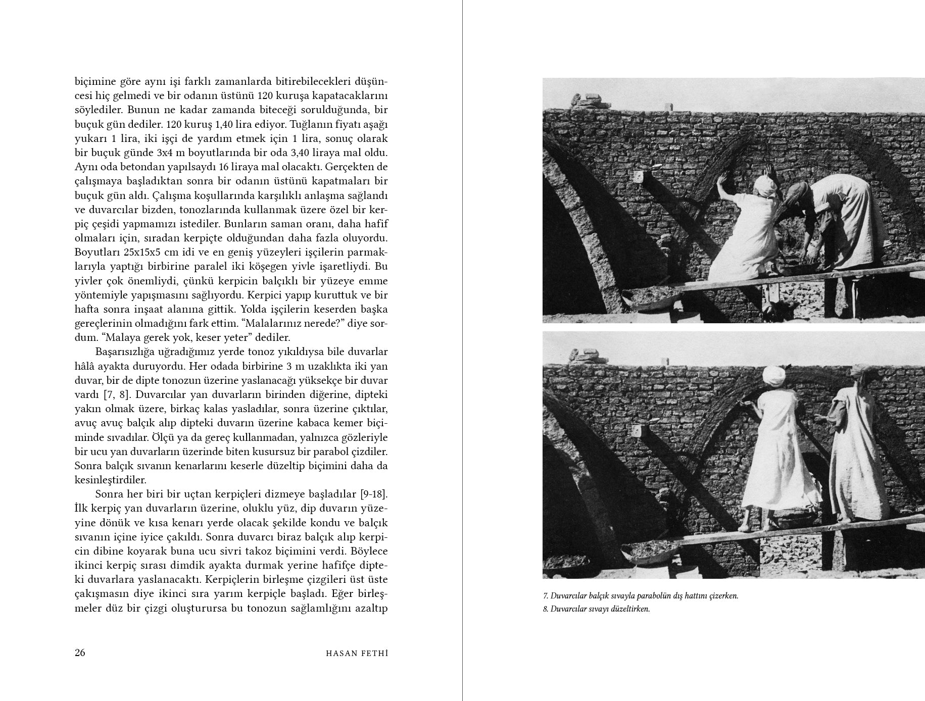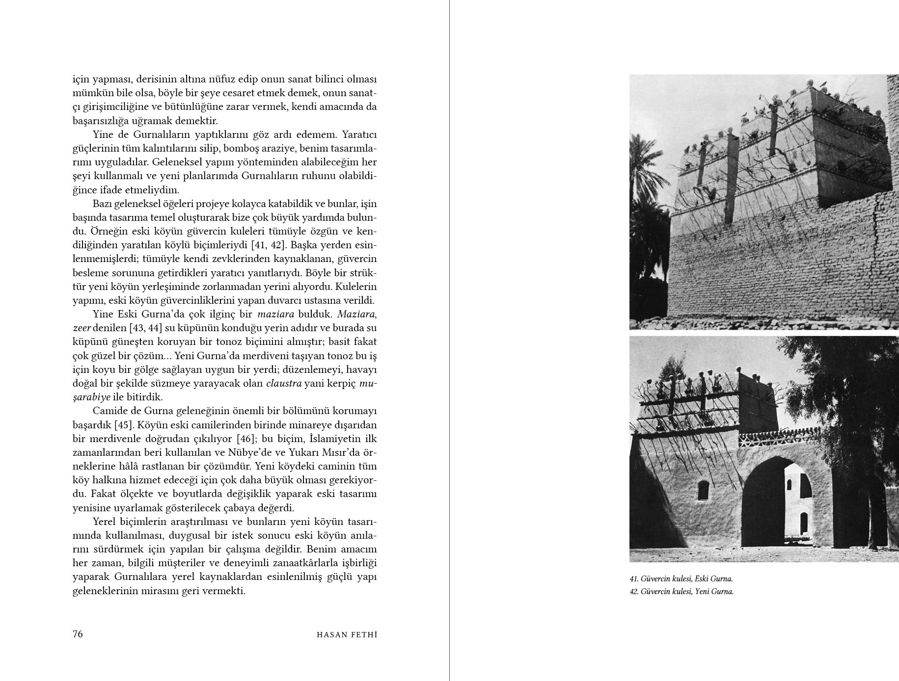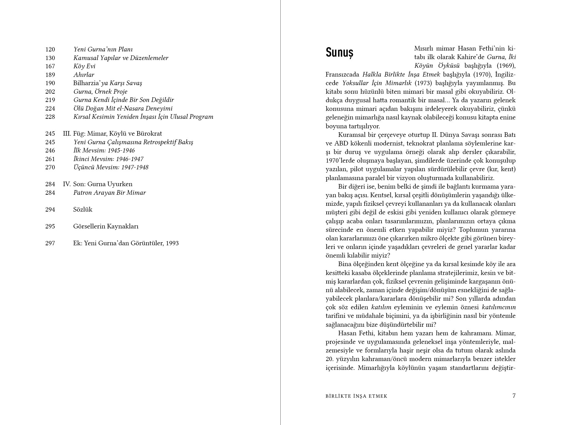 Mısırlı mimar Hasan Fethi'nin (1900-1989) Birlikte İnşa Etmek, Yeni Gurna'nın Öyküsü adlı kitabı, Serpil Özaloğlu Merzi'nin çevirisi ve Aykut Köksal'ın editörlüğüyle, Arketon Yayınları arasındaki yerini aldı. Hasan Fethi, kitabında, mimarlık serüveninin iki boyutunu iç içe anlatıyor: Bunlardan ilki, geleneksel bir yapı malzemesi olan kerpici güncel uygulamalara taşımak; ikincisi ise, arkeolojik bir alan üzerinde olduğu için yeri değiştirilen Gurna köyünü, yeni yerinde köylülerle birlikte inşa etmek. Hasan Fethi, 1946'dan 1952'ye dek süren inşa sürecini anlatmakla kalmıyor, köylülerin yaşam ve sağlık koşullarını iyileştirme çalışmalarından, süreci yürütmek için devlet bürokrasisiyle girdiği mücadeleye uzanan geniş bir anlatı çerçevesi kuruyor.
