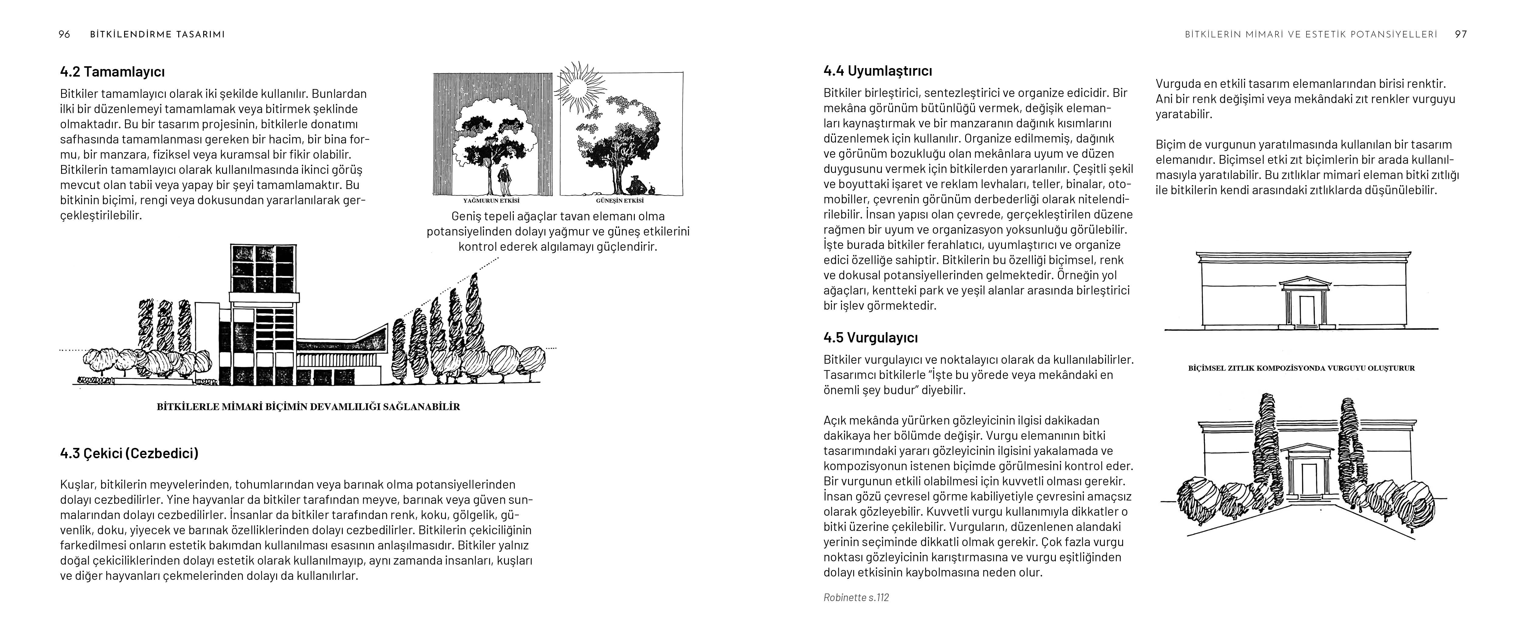 “Bitkilendirme Tasarımı” kitabında ağaçların, çalı grubu bitkilerle yer örtücü ve sarılıcı bitkilerin ekolojik, mimari, estetik ve işlevsel potansiyelleri ile mekân tasarımında kullanım teknikleri açıklanmıştır.