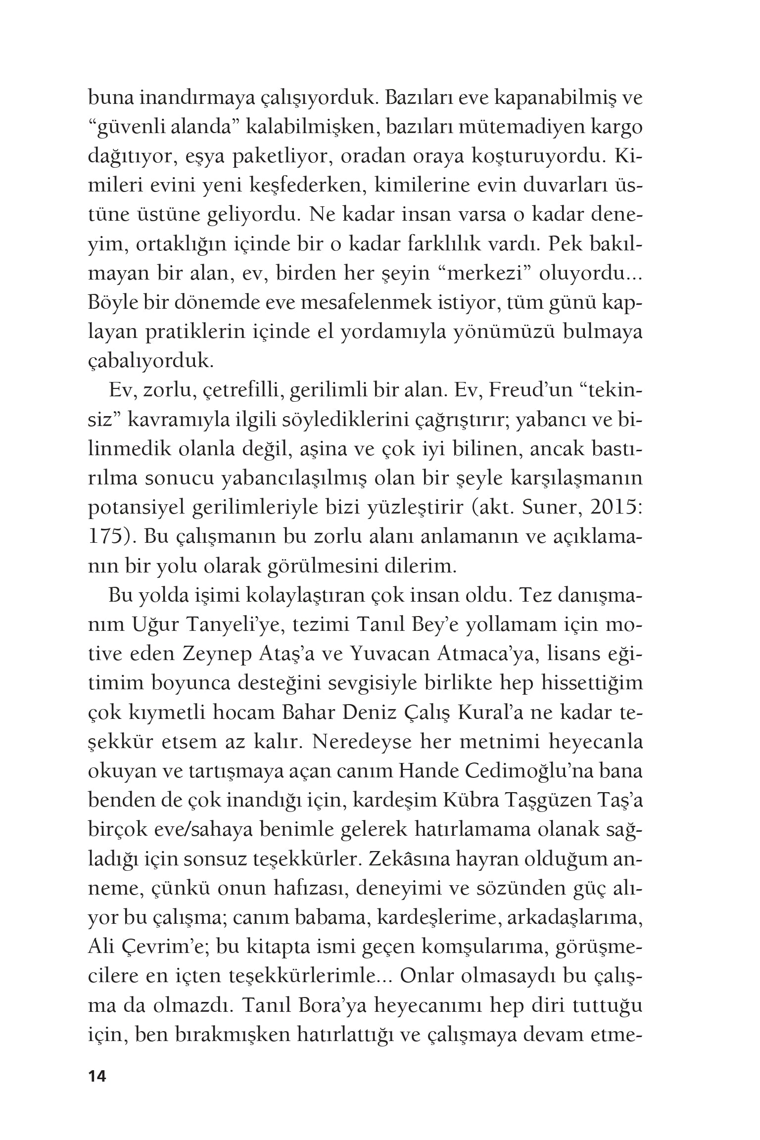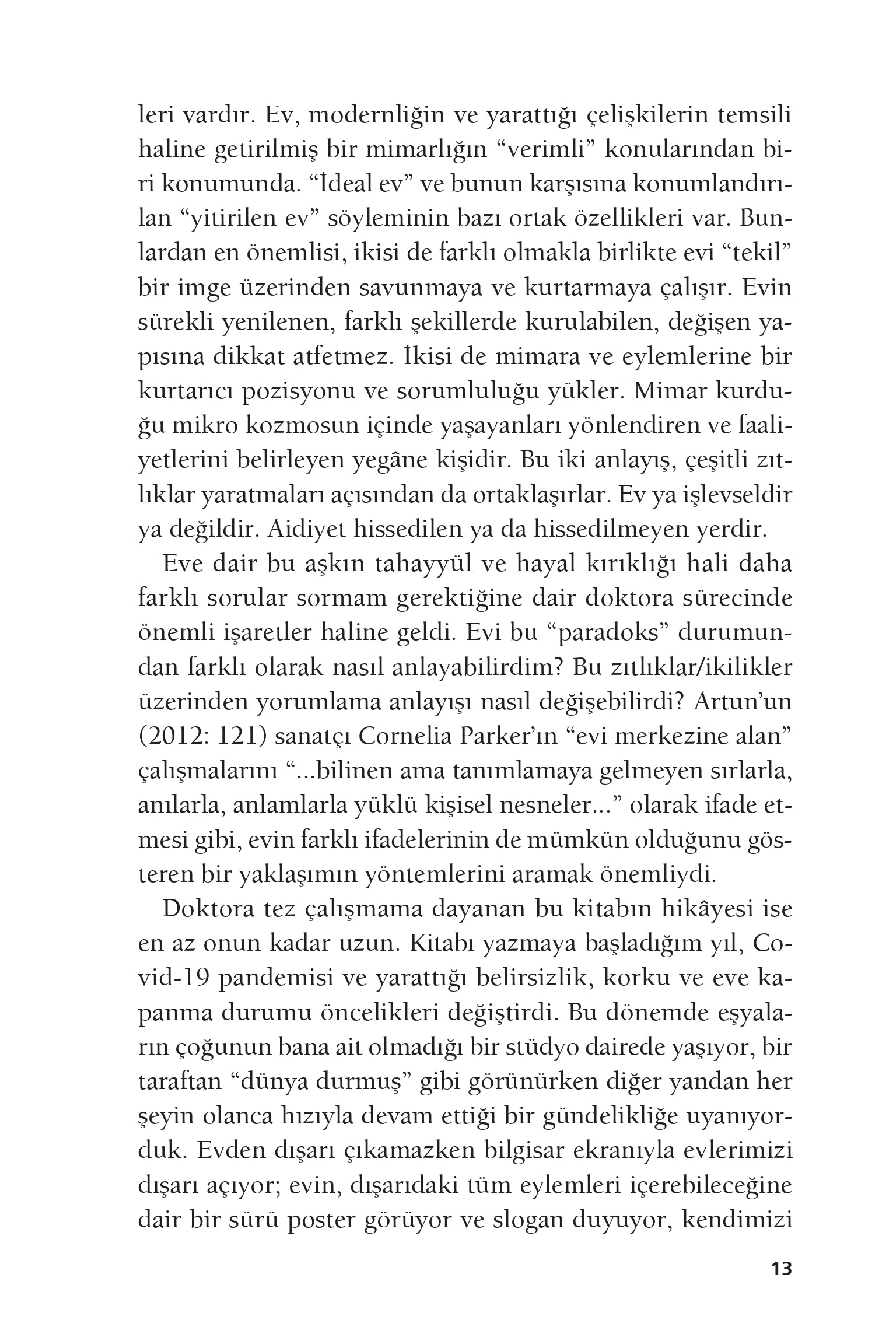 Zemzem Taşgüzen Polat, mimarlık tecrübesini ve sosyal teori bilgisini, kendi hayatından canlı gözlemlerle tartarak, ev denen koca dünyanın içine dalıyor. Bir deneyim mekânı olarak, bir hayat olarak eve bakıyor. Evin nasıl bir “iç” olduğunu ve aynı zamanda nasıl dışarıya açılmanın yerine dönüştüğünü, evin sınırlarını düşünüyor.