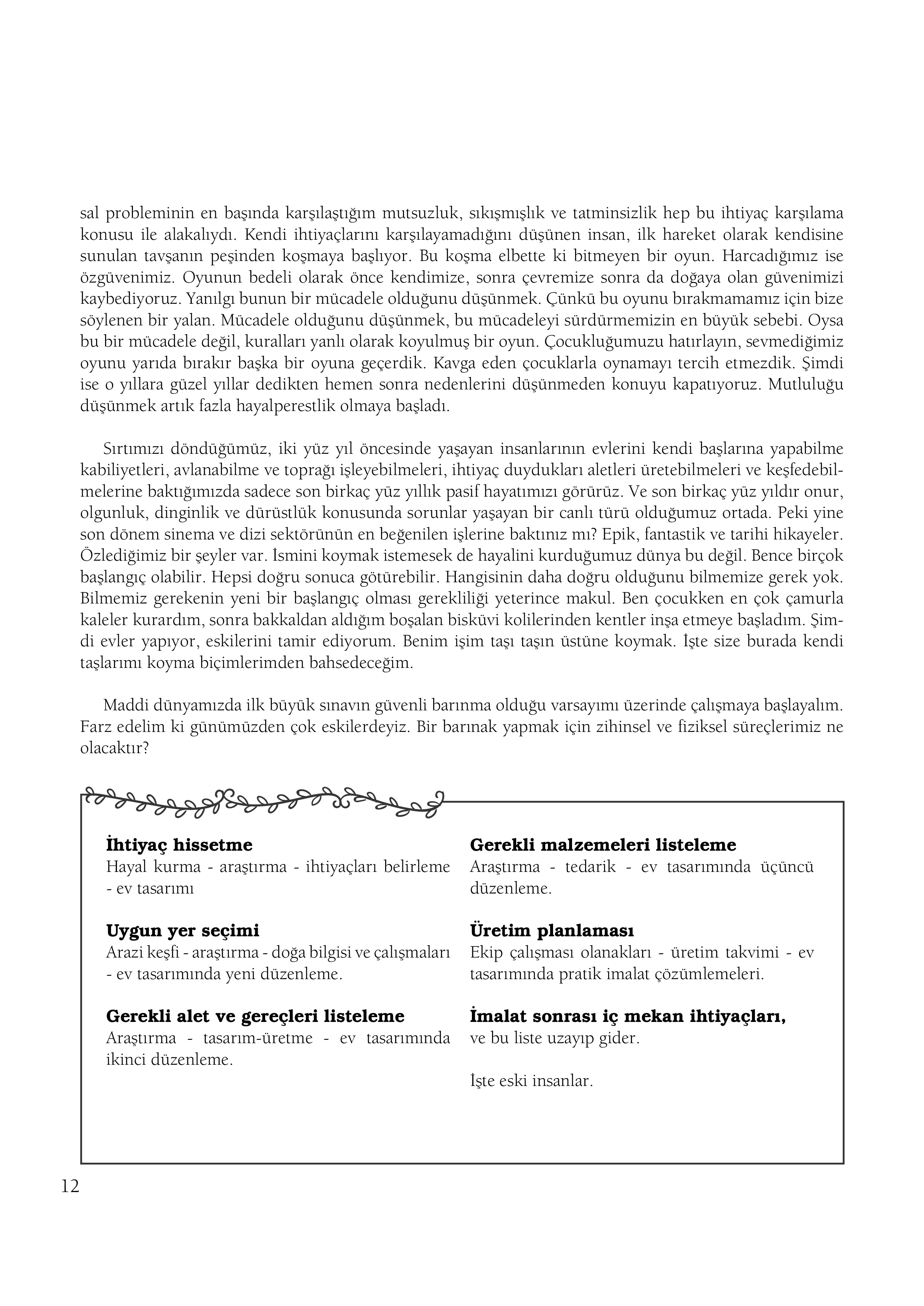 Peki gerçekten mümkün mü? Çok yakın bir tarihe kadar, hepimizin yaşadığı ev kendi ellerimizle ve köy imecesi ile yapılıyorken; Çölde, kutuplarda, dağ başları, nehir kenarlarında ya da çok uzak adalarda. Bütün insanlık coğrafyalarına özel tasarımlar ve nesilden nesile aktarılan bir sintineler mevcuttu. Taş seçiminden, ağaçların kesileceği mevsim hatta ay tartışmaya kadar, şimdi bilimsel insanı hayrete düşüren bir teknik ve tasarımla. genelinde bu yapılar binlerce blok halinde okuyor. Betonun altmış yıllık ömrü, bunlar sadece güldürüyor.