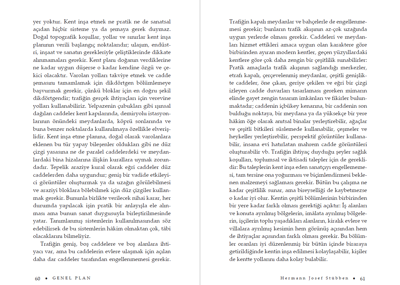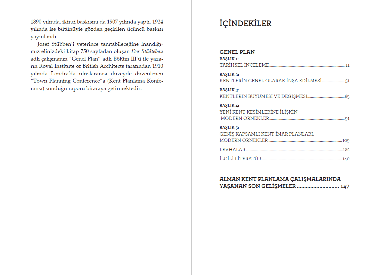 Hermann Josef Stübben’in başlıca eseri olan Der Städtebau kent planlama ilkeleri ve uygulamaları konusunu ansiklopedik anlayışla ele alıyor. Josef Stübben’i yeterince tanıtacağına inandığımız elinizdeki kitap 750 sayfadan oluşan Der Städtebau adlı çalışmanın “Genel Plan” adlı Bölüm 3'ü ile yazarın Royal Institute of British Architects tarafından 1910 yılında Londra’da uluslararası düzeyde düzenlenen “Town Planning Conference”a (Kent Planlama Konferansı) sunduğu raporu biraraya getirmektedir.
