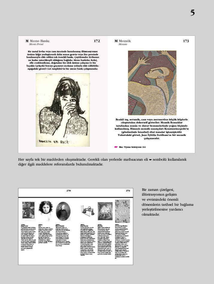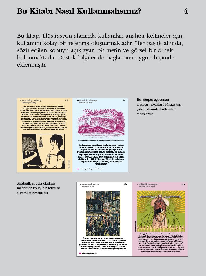 Soyutlama'dan Zamanın Ruhu'na, Resim Kitapları'ndan Poster'e kadar geniş bir kavram yelpazesini kapsayan eser, illüstrasyonun temel taşlarını, yaratıcı süreci ve endüstri içindeki kullanımını anlatıyor. Kitaptaki her terim, tarihi ve çağdaş bağlamlarıyla birlikte açıklanmış, ilgili örneklerle desteklenmiş ve İngilizce karşılıklarıyla sunulmuştur.