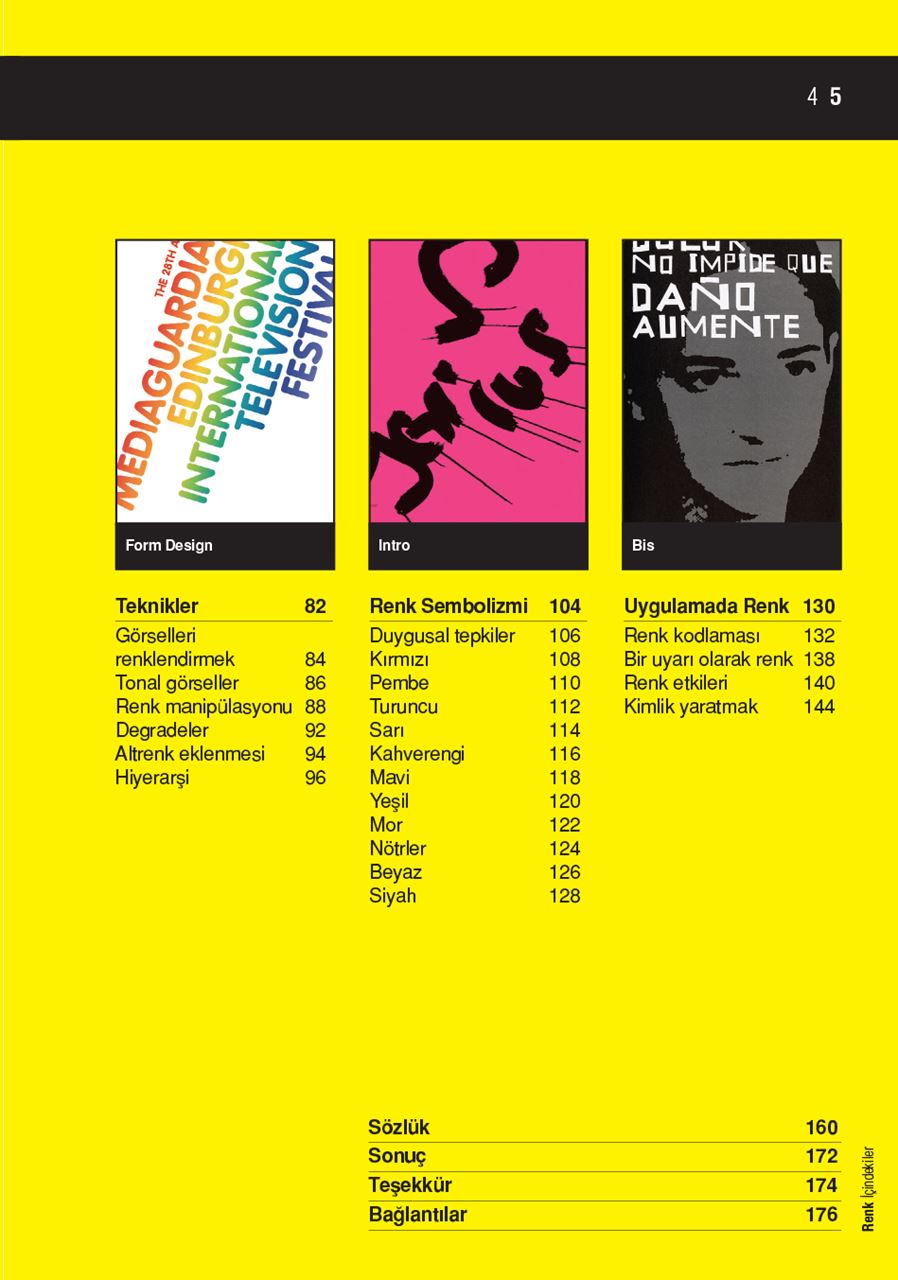 Öne Çıkan Başlıklar; Renk Kodları, Renkleri Betimlemek, Renkçarkı Seçimi, Renk Bileşimleri, Renk Sistemleri, Özel-Üretim Renkleri, Floresanlar, Metalikler, Renk Planlaması, Renk Detaylandırması, Renk Katmanları, Tonlar, Üst Üste Baskı, Görselleri Renklendirmek, Renk Manipülasyonu, Degrade, Alt Renk Eklenmesi, Renk Kodlaması, Uyarı Olarak Renk, Rengin Etkisi, Bir Kimlik Yaratmak