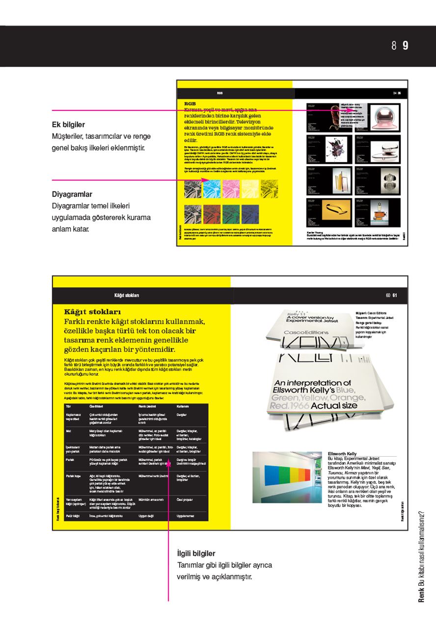 Renk, grafik tasarımda renk kullanımı üzerine bir rehberdir. Renk, düşünceleri ve duyguları tasarımın başka hiçbir öğesinin yapamadığı şekilde temsil eder. Kitap, renklerin ne anlama geldiğini, özünü ve kültürel bağlamını derinlemesine inceler. Bu aşamadan sonra da tasarımda amaçlanan etkiyi elde etmek için, rengin nasıl kontrol altında tutulabileceğini anlatır. İçinde kullanılan mürekkep çeşitliliğiyle kendi başına grafik tasarımda renk kullanımına örnek oluşturan kitapta pantone, metalik ve floresan mürekkepli görseller, rengin kâğıt üzerindeki etkilerini birebir sunmaktadır. Kâğıtlar çok çeşitli renklerde mevcuttur ve bu çeşitlilik tasarımcıya pek çok farklı türü birleştirmek için yaratıcı potansiyel sağlar. Rengin bu özelliği kitapta kullanılan üç farklı kâğıt stokuyla okuyucuya sunulmuştur.