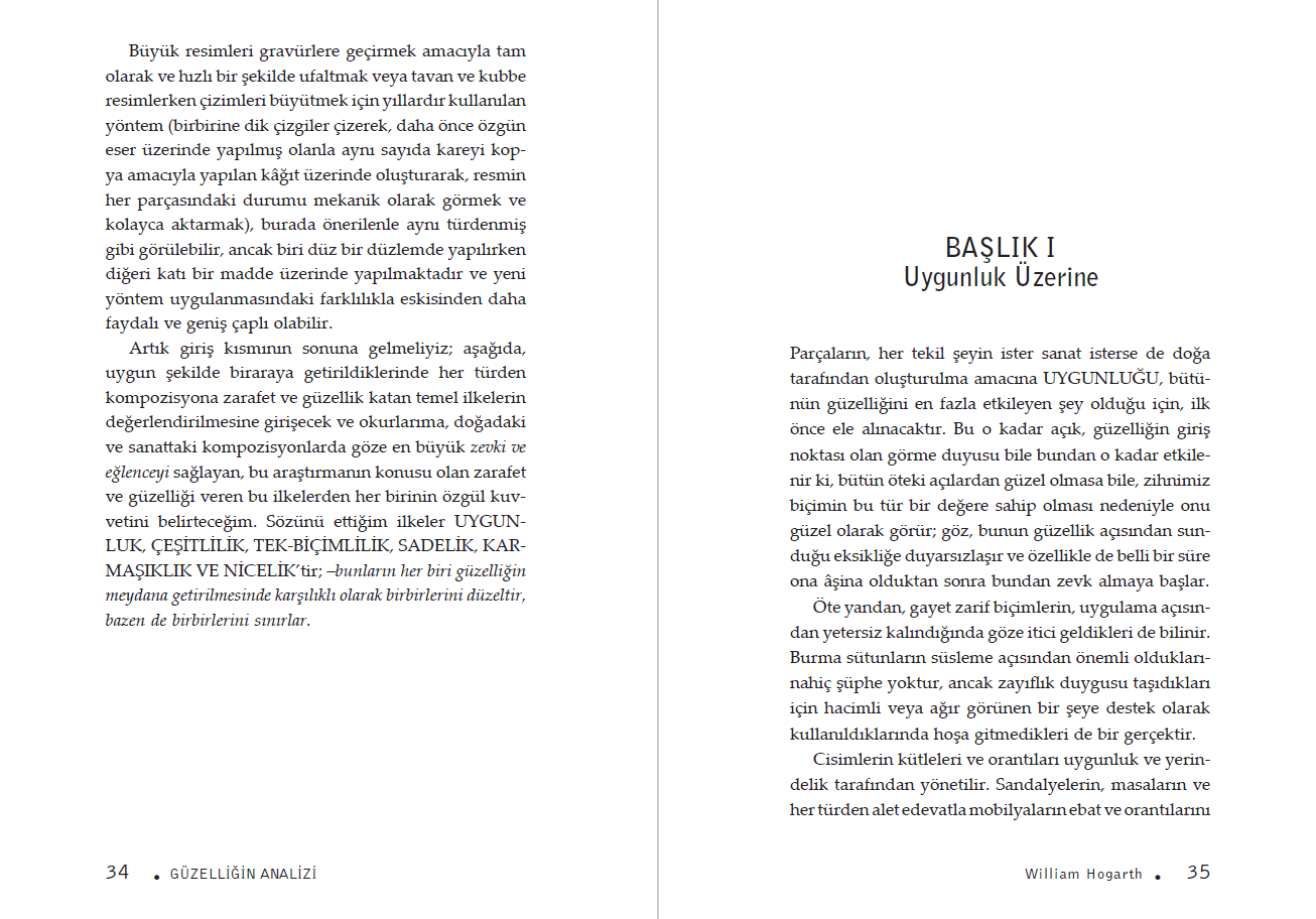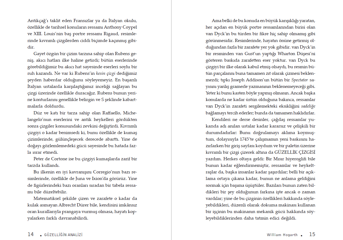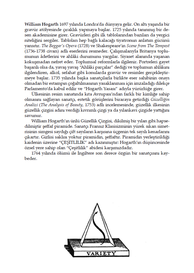 18. yüzyıl estetik tartışmalarının önemli metinlerinden biri olan Güzelliğin Analizi, Hogarth’ın sanat kuramına yaklaşımını yalnızca teorik düzeyde değil, görsel örnekler ve gözleme dayalı açıklamalarla da ele alır. Eserde, güzelliğin evrensel ölçütleri, algı, biçim ve hareket ilişkisi üzerinden tartışılır; sanatın doğayla ve insan duyularıyla kurduğu bağ kapsamlı biçimde değerlendirilir.