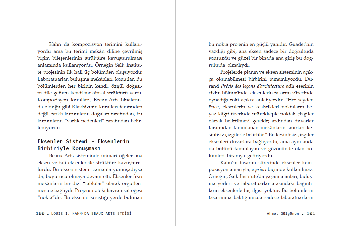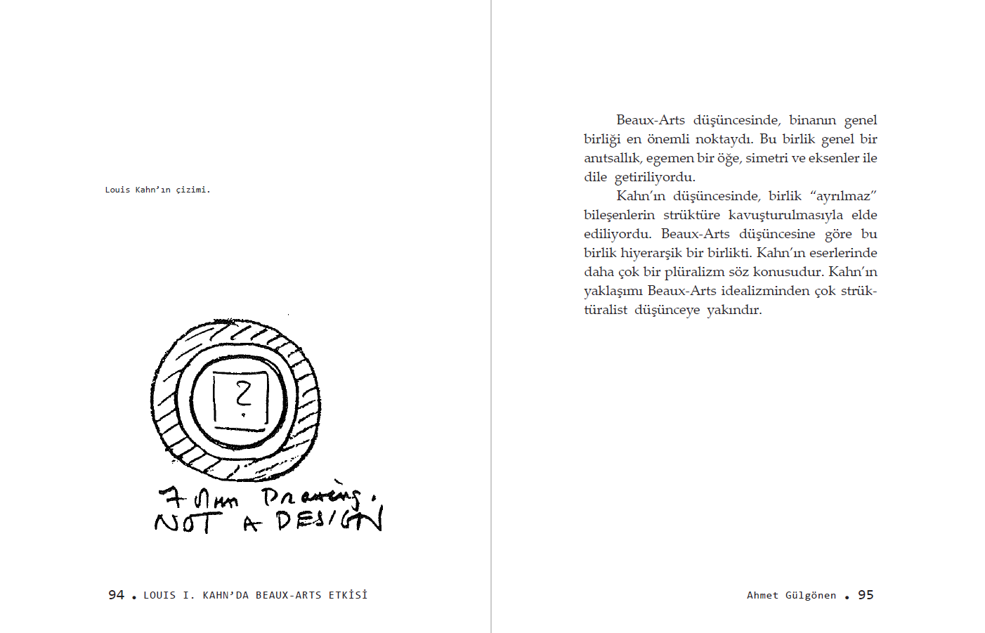 “Mekânların eksenel bir kompozisyon dahilinde birbirine peş peşe bağlandığı Beaux-Arts idealiyle karşılaştırıldığında, Kahn'da mekânların, tam tersine, özgül düzenlerini koruduğunu görürüz (…)”