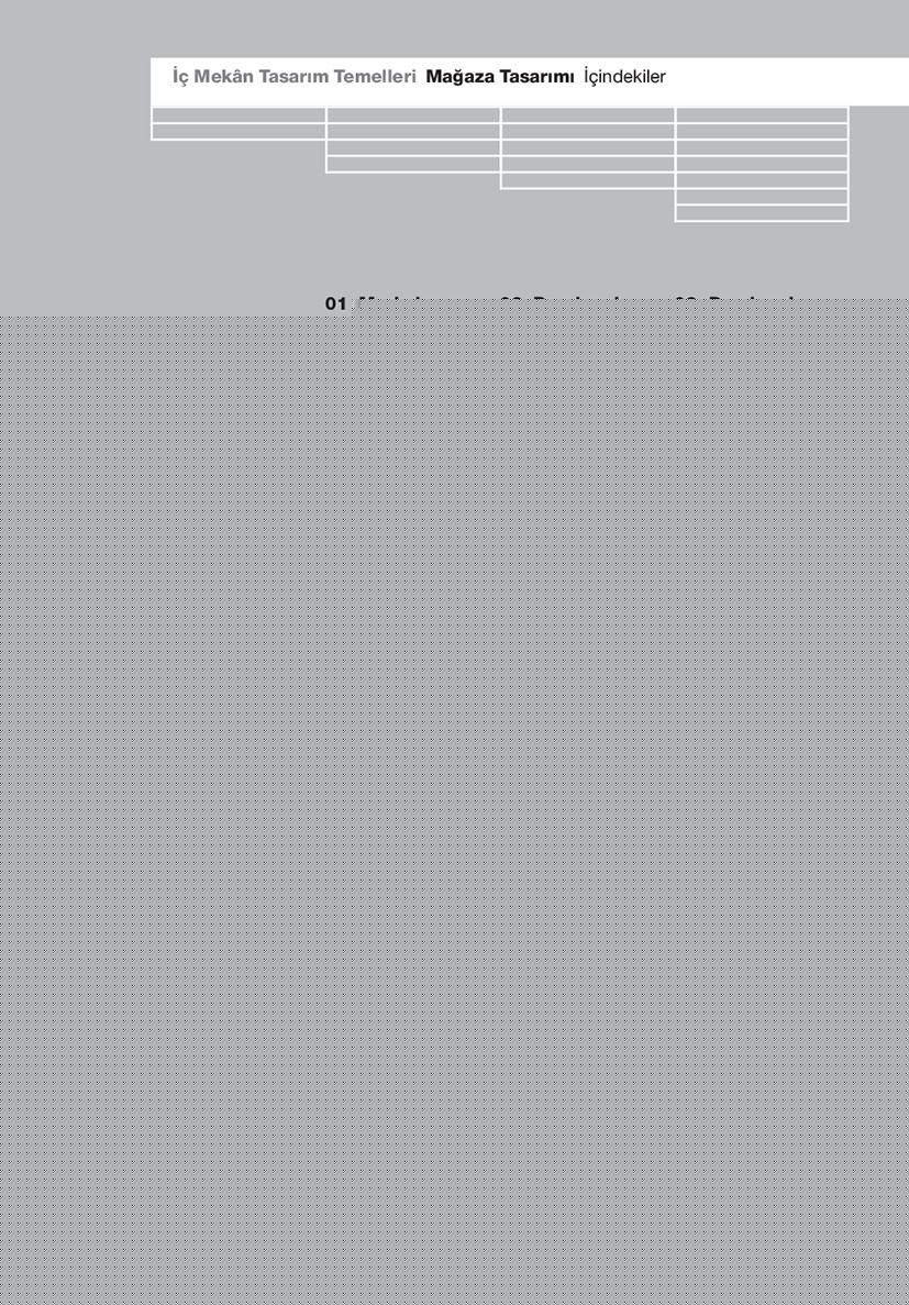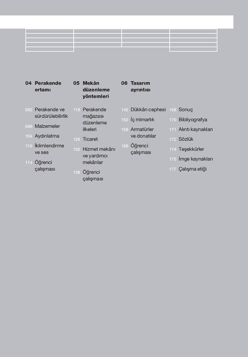 Markalaşma, Perakende Satış Mekânı Tipleri, Perakende Ortamı, Giriş, Malzemeler, Aydınlatma, İklim ve Ses, Sirkülasyon, Yürüyüş Hızı, Ürün Sergilemesi, Arka Oda, Dükkan Cephesi, Ön Cephe, Armatürler ve Donatılar, Grafikler