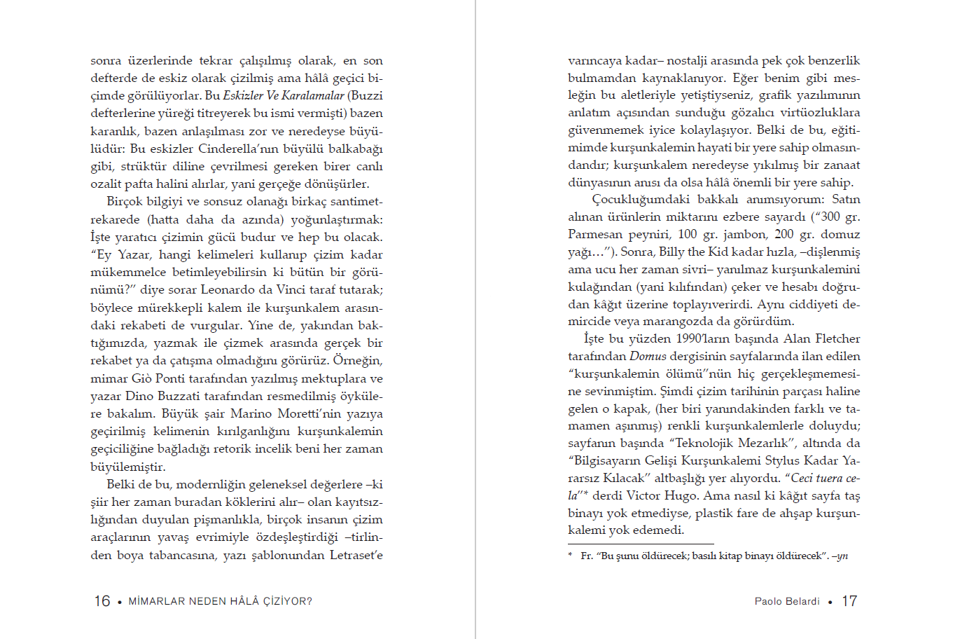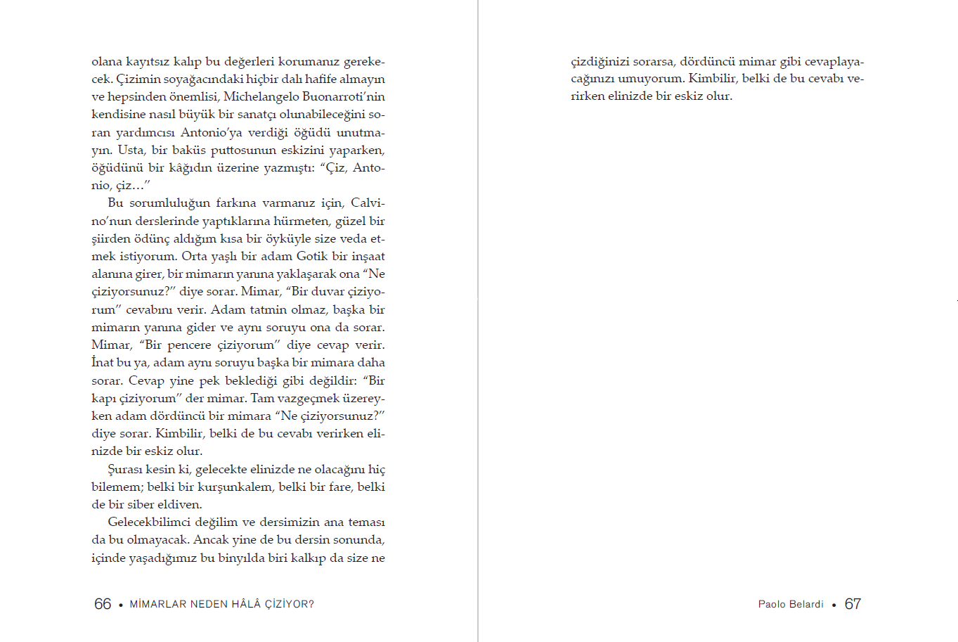 Kitap boyunca insanlığın bütünlüklü tarihinin içinden geçiyoruz. Aralarında bağ olmadığı sanılan önemli insanların hangi kaygılarla birbirlerine bağlandığını görüyoruz: Michelangelo Buonarroti ve Albert Einstein, Andrea Palladio ve Louis Armstrong, Giacomo Leopardi ve Robert Venturi. Hepsi de bize bildiğimiz üç boyut, yani genişlik, yükseklik ve derinliğin yetersiz kaldığını, bunlara iki boyutun daha, tarihin ve kültürün de eklenmesi gerektiğini söylüyor. Mimarlar işte bunun için hâlâ çiziyor.