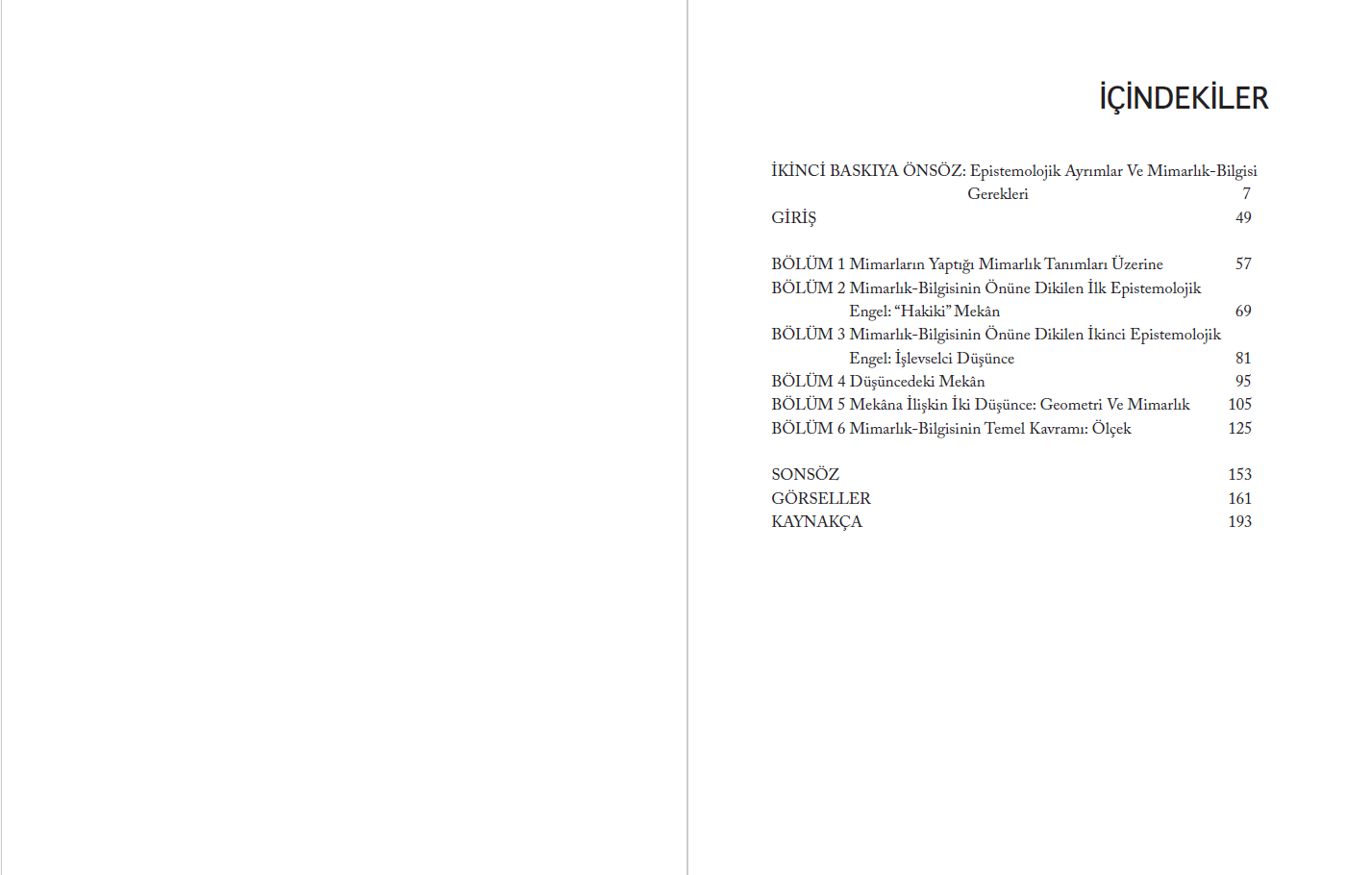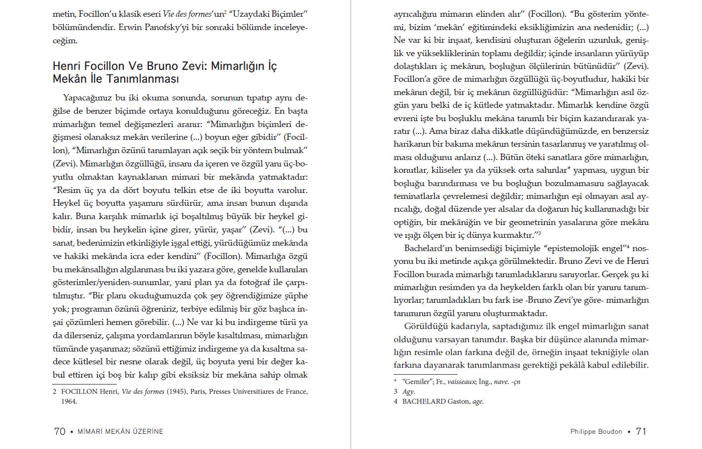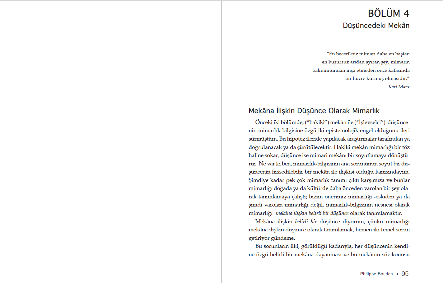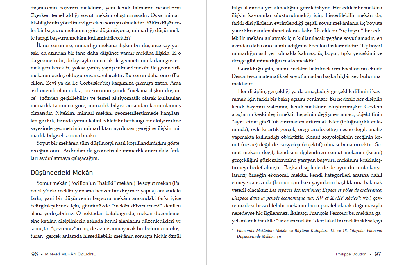 Philippe Boudon'un klasikleşmiş çalışması Mimari Mekan Üzerine yazar tarafından gözden geçirilen ve yorumlarla beslenen yeni basımıyla dilimizde. Mimarlık Epistemolojisi Üzerine Deneme alt-başlığını taşıyan bu çalışma, mimari tasarımın mimarlıkta bilimsel araştırma konusu olabileceği tezine dayanmaktadır. Tasarlanan mekanın hakiki mekan ile karşılaştığı yere Vitruvius, Popper, Bachelard, Zevi, Focillon, Simon, Merleau-Ponty, Viollet-le-Duc, Le Corbusier, Wittkower, Rasmussen, Panofsky ve daha niceleri kendi mekanlarını alıp geldiler. "Bachelard, her gün yaşandığı biçimiyle mekan ile bu mekanı anlamak için kurulan mekanı birbirinden ayırır (....)" "(...) mimari mekanın sadece tasarlandığı için varolması gerektiği (...)"