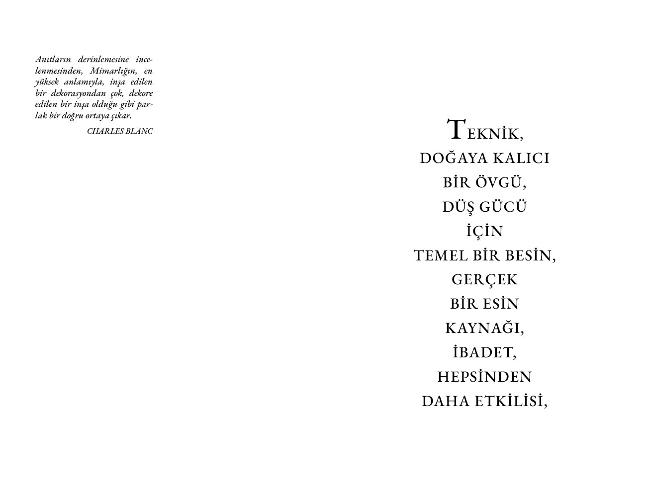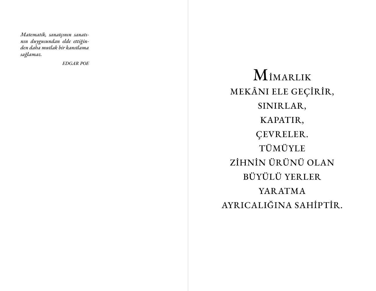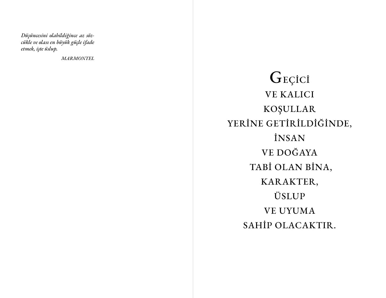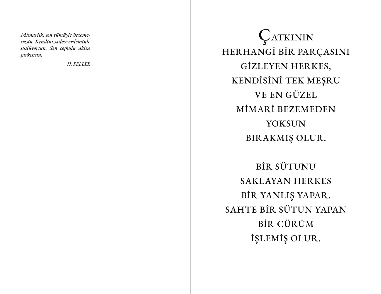 Auguste Perret'nin aforizmalara düşkün olduğu bilinir. Yaşamı boyunca not ettiği aforizmalar, Wright, Rodin, Choisy gibi mimar ya da sanatçılardan, Proust, Baudelaire, Montaigne gibi yazın insanlarına dek uzanıyor. Ne ki Perret, yalnızca aforizma derlemekle kalmamış, mimarlık üzerine kendi düşüncelerini de kısa ve öz tümcelerle yazıya dökmüş. Bunları ilk kez, 1945'te Techniques et Architecture adlı dergide yayımlamış. Kitaplaşmaları ise 1952'de gerçekleşmiş. Contribution à une théorie de l'architecture başlığını taşıyan ve André Wahl'ın editörlüğünde yayımlanan kitapta on beş aforizma yer alıyor. Kitabın sayfa düzeni Henri Jonquières'in imzasını taşıyor. Perret'nin bu ikonik kitabı Türkçeye aktarılırken, 1952 basımının tüm kararları korundu; tek değişiklik özgün boyutun belirli bir oranda küçülmesi oldu.