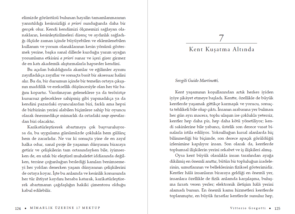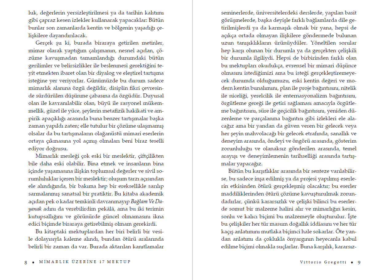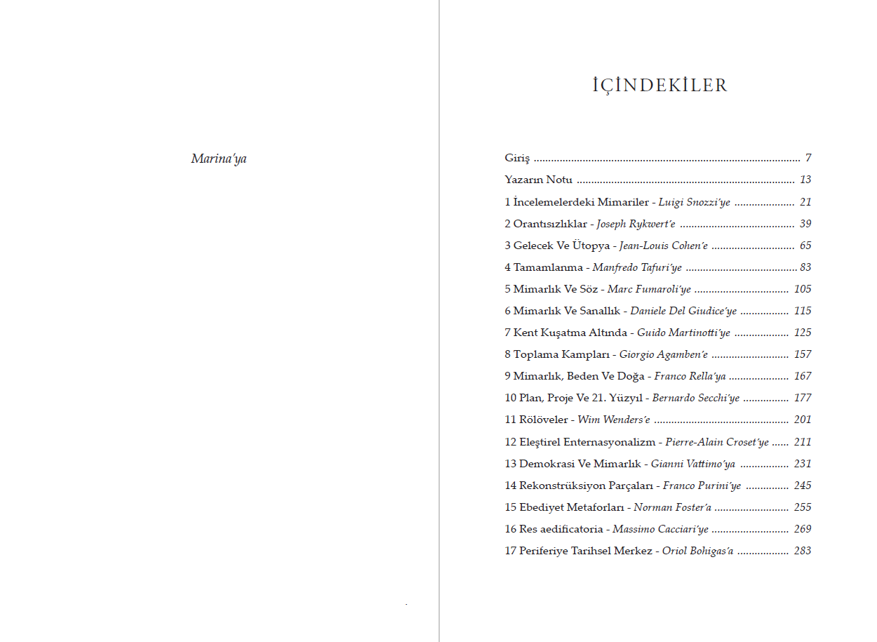 "Bu kitapta edebiyat ve siyaset, kuramsal düşünme ve tarih, sinema ve görsel sanatlar mimarlığı savunmak için çağırıldılar; bunu da parçalanma, süre, atopi, karikatür, günlük yaşamın estetikleştirilmesi, toplumsal sorumluluk, değerlerin yersizleştirilmesi ya da tarihin kalıtımı gibi çapraz kesen izlekler kullanarak yapacaklar: Bütün bunlar son zamanlarda kentin ve bölgenin yaşadığı çelişkilere dayandırılacak."