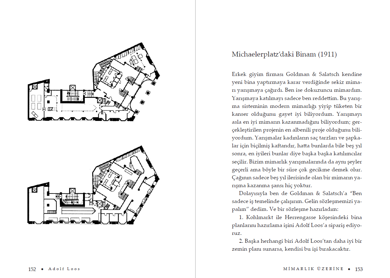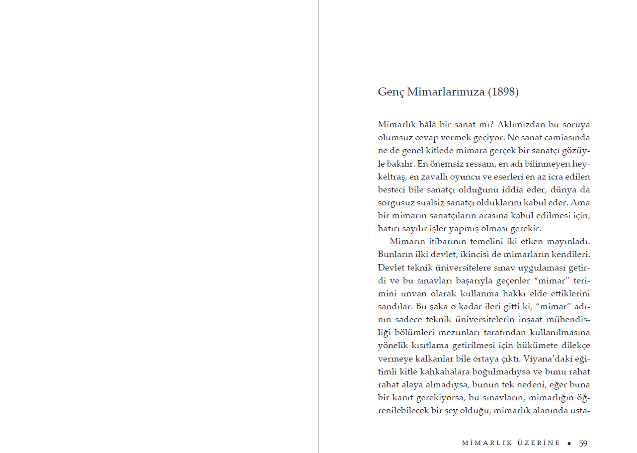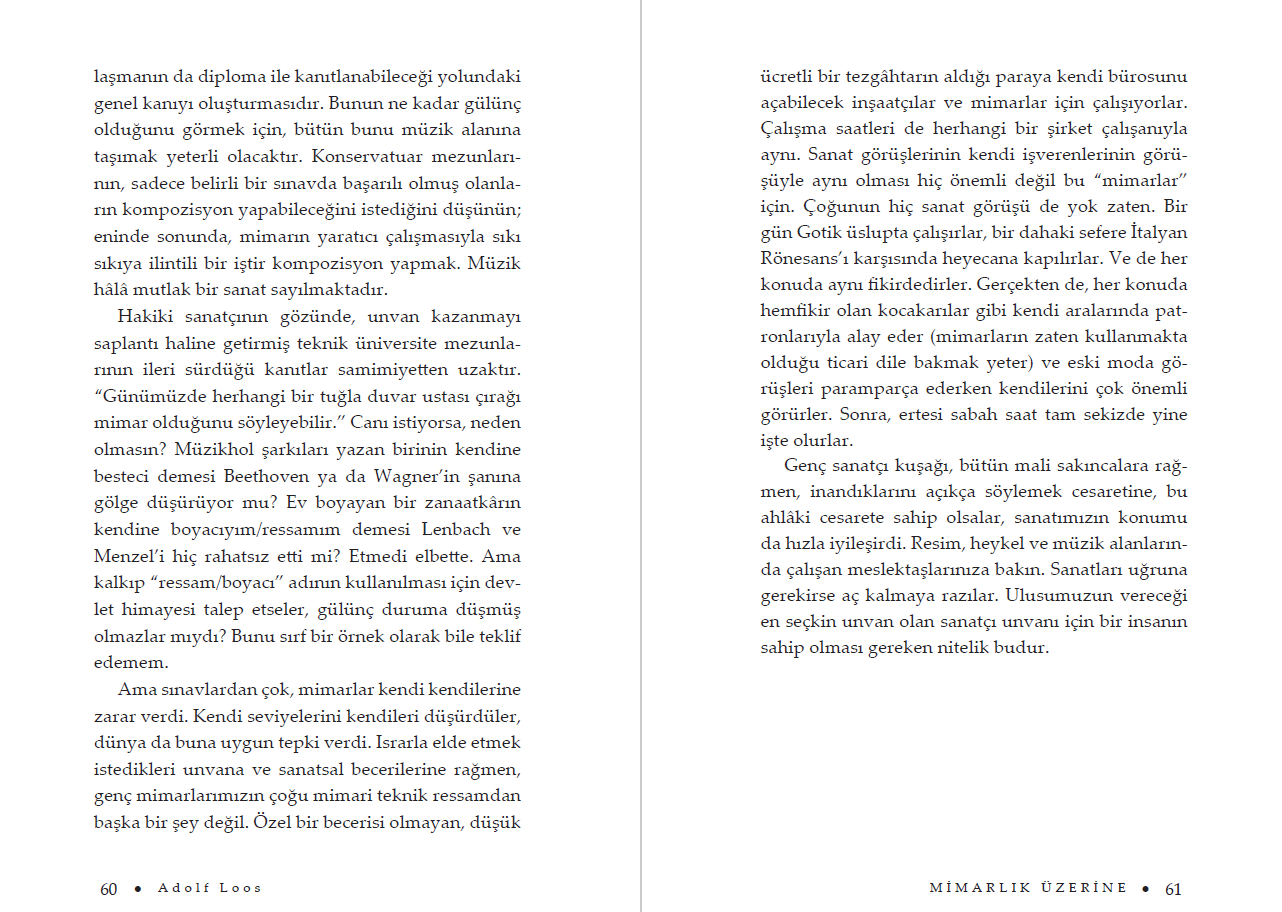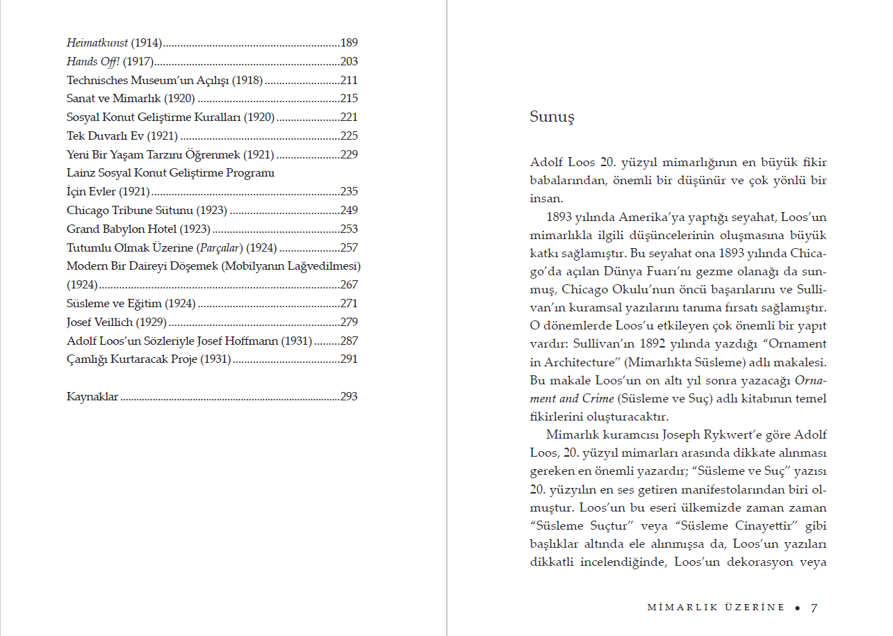 Elinizdeki kitapta, mimarlık içeren belki de en güçlü yazarlardan biri, mimar Adolf Loos, olanca dürüstlüğüyle yaşadığı mesleğini tanıtıyor. Loos'un mimarlık üzerine etkilerinin büyük bir bölümünün biraraya toplanmasının önemi ancak okunduktan sonra anlaşılabilecektir.