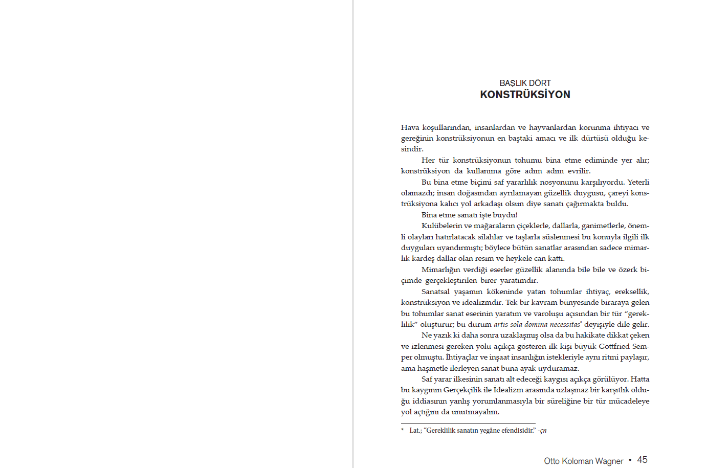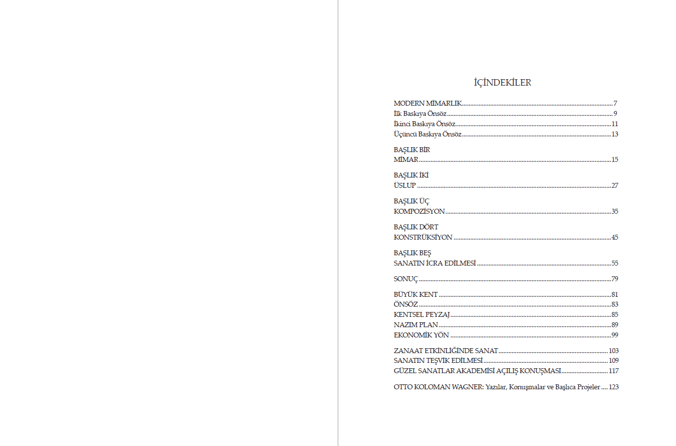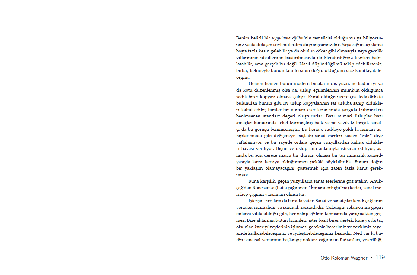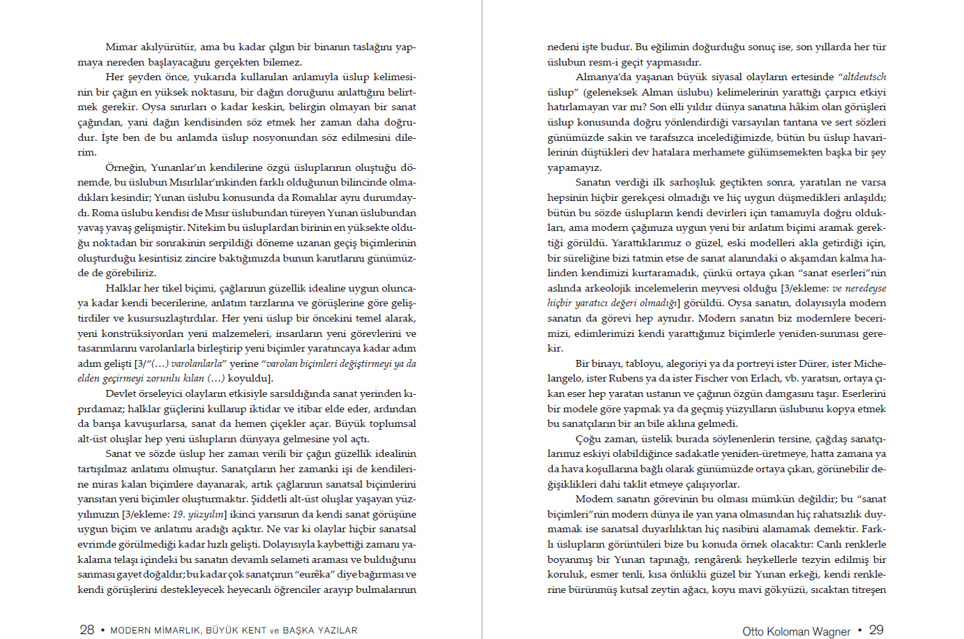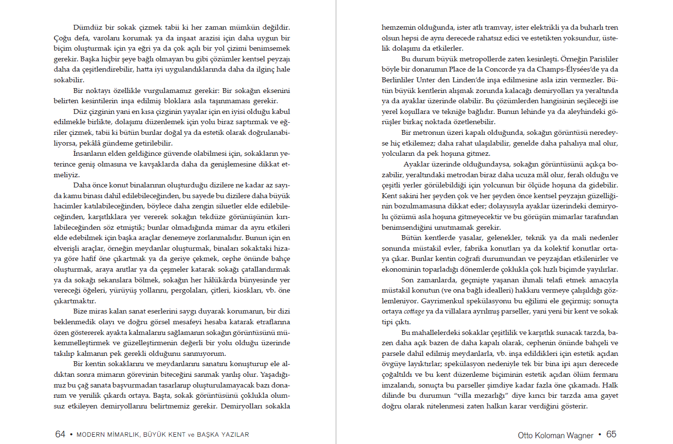 Otto Koloman Wagner Viyana büyük burjuvazisi bünyesinde yerini sağlamlaştırmış, ünlü bir mimarken, 1896 yılında dönemin estetik anlayışına şiddetle saldırdığı Moderne Architektur (Modern Mimarlık) adlı çalışmasıyla geniş bir çevreyi şaşkınlığa sürükledi. Atlantik’in öte yakasında ve Avrupa’da yaşanan yenilikleri dikkatle gözlemleyen Wagner, bu metinle bütün meslek yaşamını dayandırdığı muhafazakâr yolu terk etti. Bakışlarını modern insanın yaşamına ve ihtiyaçlarına çevirdi. Daha ileriki bir tarihte kaleme aldığı Die Großstadt (Büyük Kent) başlıklı çalışmasında ise düşüncelerini kente, özellikle de Avrupa’daki büyük kentlere yöneltti. Kenti ve mimarisini modernliğin temeli yapmaya çalışan metinler…