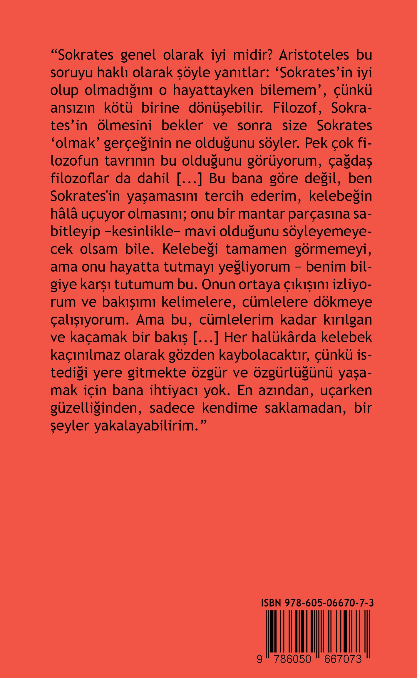 “Sokrates genel olarak iyi midir? Aristoteles bu soruyu haklı olarak şöyle yanıtlar: ‘Sokrates’in iyi olup olmadığını o hayattayken bilemem’, çünkü ansızın kötü birine dönüşebilir. Filozof, Sokrates’in ölmesini bekler ve sonra size Sokrates ‘olmak’ gerçeğinin ne olduğunu söyler. Pek çok filozofun tavrının bu olduğunu görüyorum, çağdaş filozoflar da dahil [...] Bu bana göre değil, ben Sokrates'in yaşamasını tercih ederim, kelebeğin hâlâ uçuyor olmasını; onu bir mantar parçasına sabitleyip −kesinlikle− mavi olduğunu söyleyemeyecek olsam bile. Kelebeği tamamen görmemeyi, ama onu hayatta tutmayı yeğliyorum − benim bilgiye karşı tutumum bu. Onun ortaya çıkışını izliyorum ve bakışımı kelimelere, cümlelere dökmeye çalışıyorum. Ama bu, cümlelerim kadar kırılgan ve kaçamak bir bakış [...] Her halükârda kelebek kaçınılmaz olarak gözden kaybolacaktır, çünkü istediği yere gitmekte özgür ve özgürlüğünü yaşamak için bana ihtiyacı yok. En azından, uçarken güzelliğinden, sadece kendime saklamadan, bir şeyler yakalayabilirim.”