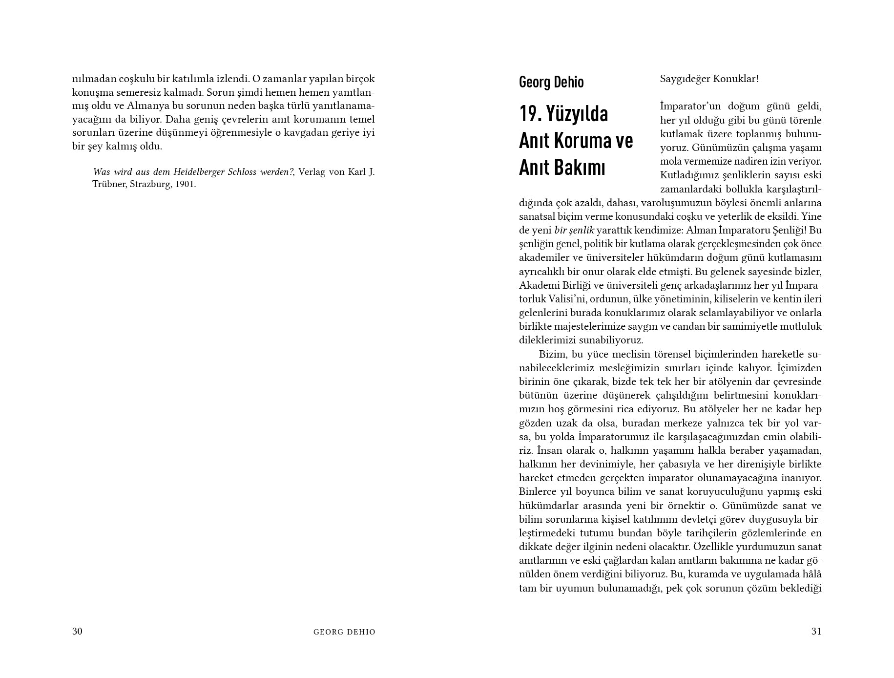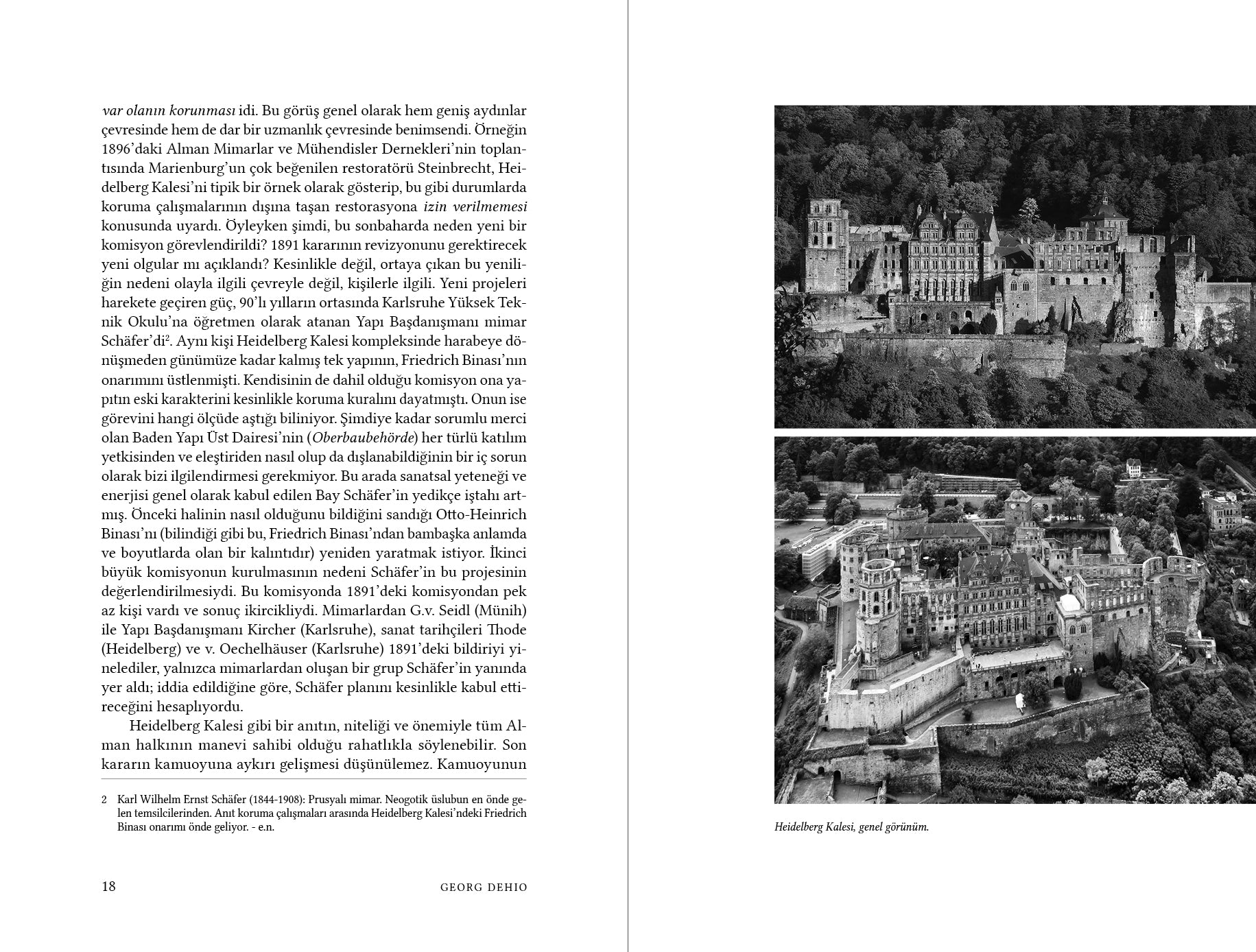 "'Restore Etmeyelim, Koruyalım!' başlıklı kitabın içeriğini oluşturan metinlerin bildirisi, Dehio'nun 'Doğru olan restore etmek değil, korumaktır' sözleriyle özetlenebilir. 19 yüzyıl, restorasyon ve koruma bağlamında iki karşıt görüşün çatışmasına sahne olmuştu. Bu görüşlerden ilki, anıtı kendi saf üslubuna götürmeyi amaçlayan Viollet-le-Duc'e, ikincisi ise, tarihsel yapıya dokunmaya hiçbir şekilde hakkımız yok diyen John Ruskin'e aitti. John Ruskin için, anıt ölmeliydi; onun güzel ölümü geleceğin mimarlarına örnek olacaktı. Ruskin'in düşüncelerinin arka planında, kökleri 17 yüzyıla kadar giden 'harabe kültürü' ve 'harabe estetiği' yer alıyor. 18 yüzyıl, 'harabe kültürü'nün doruğa ulaştığı yüzyıl olur. Diderot, harabe resimlerinden oluşan bir Salon'u gezdikten sonra 'Bir anıtı ilginç kılmak için harabeye dönüştürmek gerek.' der. İngiliz mimar John Soane bu kültürü, kendi kurduğu müzenin ana konseptine dönüştürür, harabe estetiğini bir sonraki yüzyıla taşır.