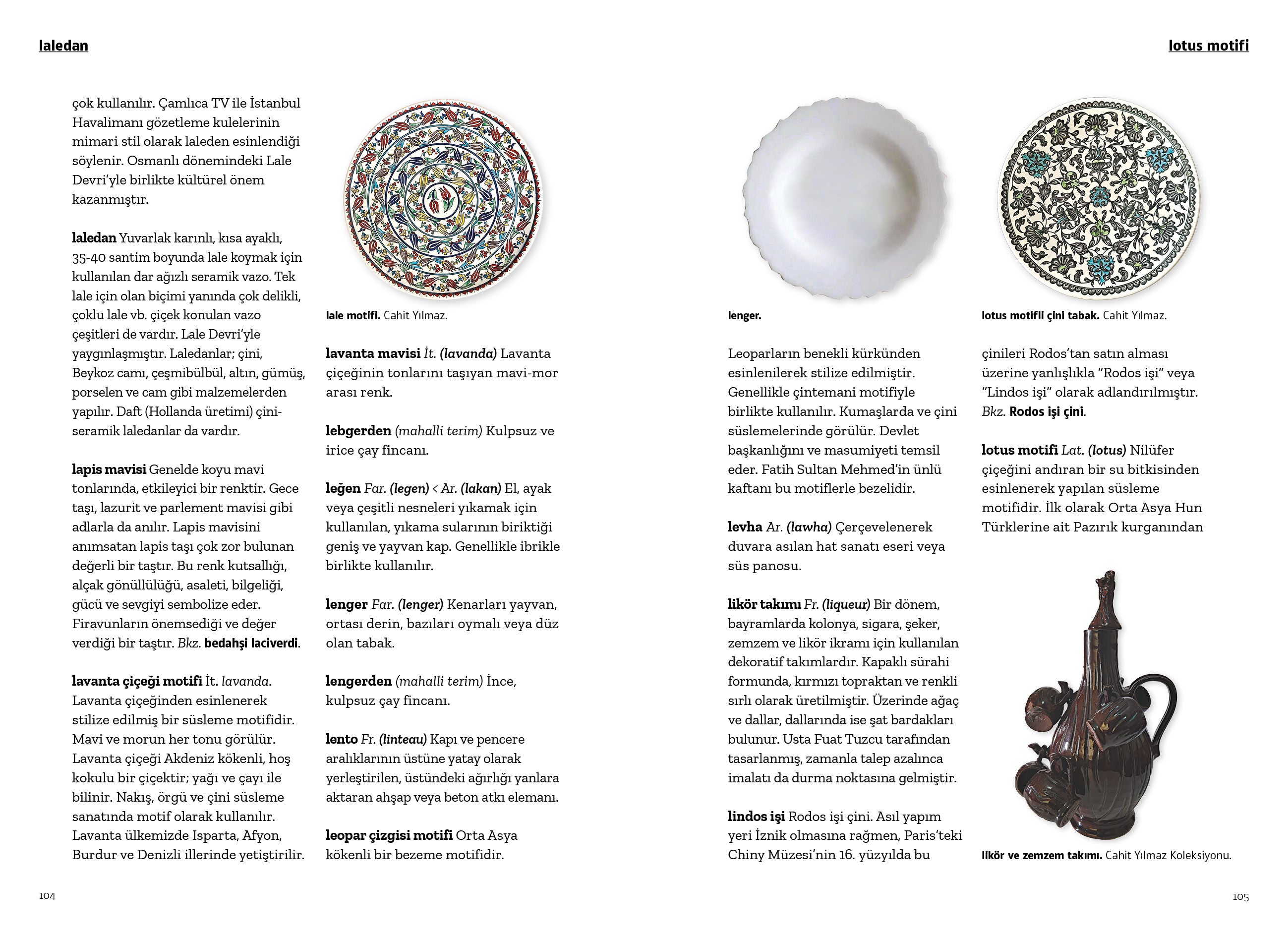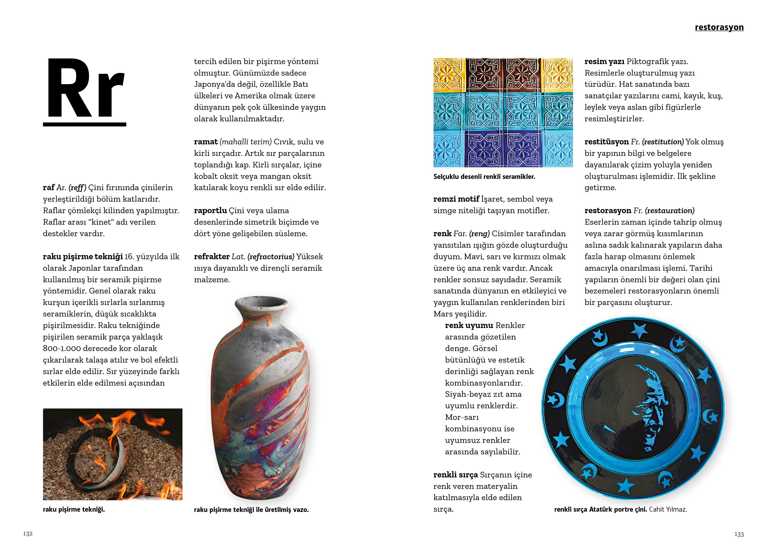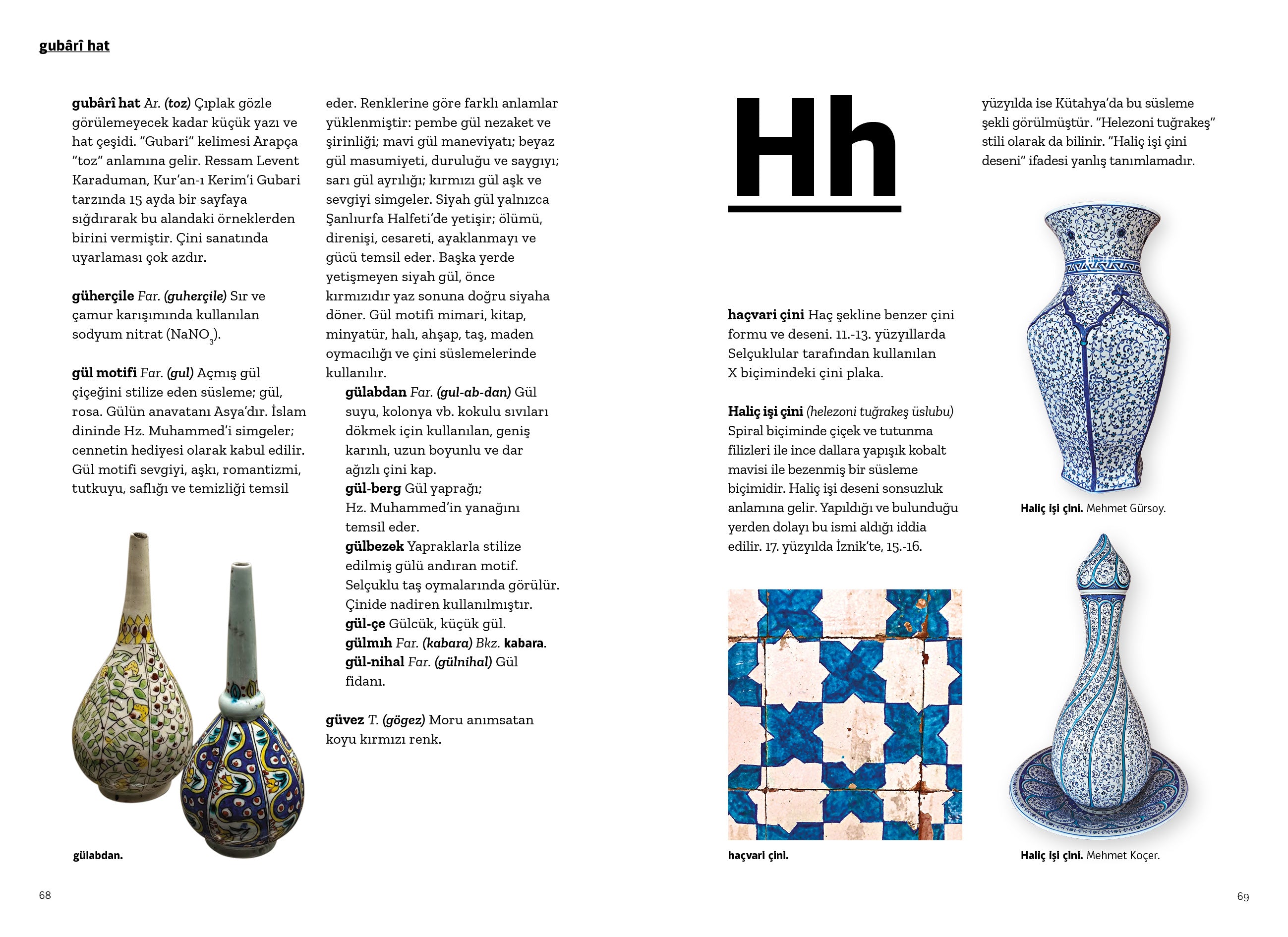 Kitapta çini ve seramik üretim malzeme, araç, teknik, yöntemlerinden motif, renk kullanımlarına; tarihi üretim merkezlerinden yöresel karakteristik ayrıntılara; ünlü çini ustalarından üsluplara uzanan geniş bir perspektif sunuluyor. Çininin yanı sıra seramik, keramik, arkeoloji, mimarlık alanlarına ait terimlere de yer verilerek zenginleştirilen, bir sözlükten çok daha derinlikli bilgilerin sunulduğu kitapta, açıklamaları verilen kavramların özgün örnekleri çok sayıda renkli fotoğraf ve çizim eşliğinde veriliyor. Böylece okuyucu ile birçoğu özel koleksiyonlarda bulunan ve ilk kez bu kitapta sunulan çok zengin bir eserler manzumesi de paylaşılıyor.