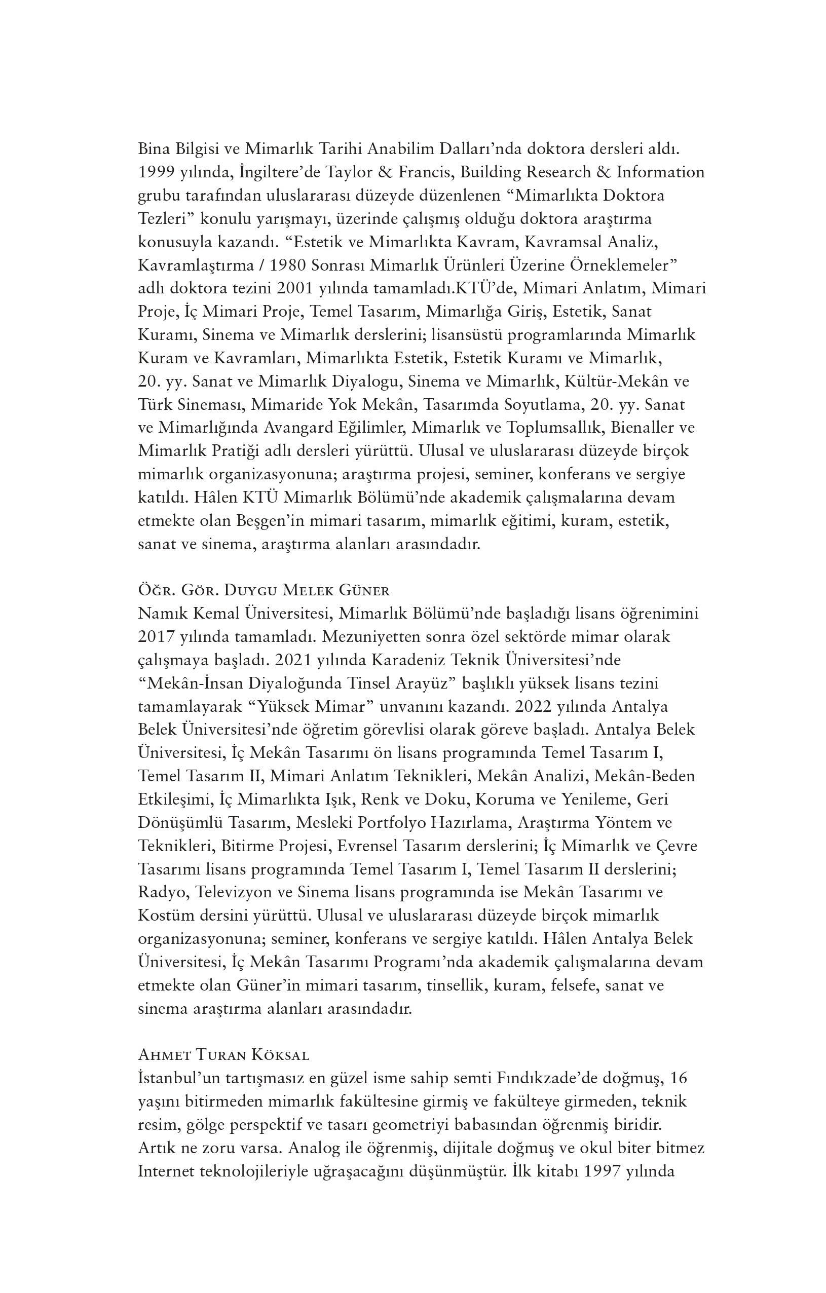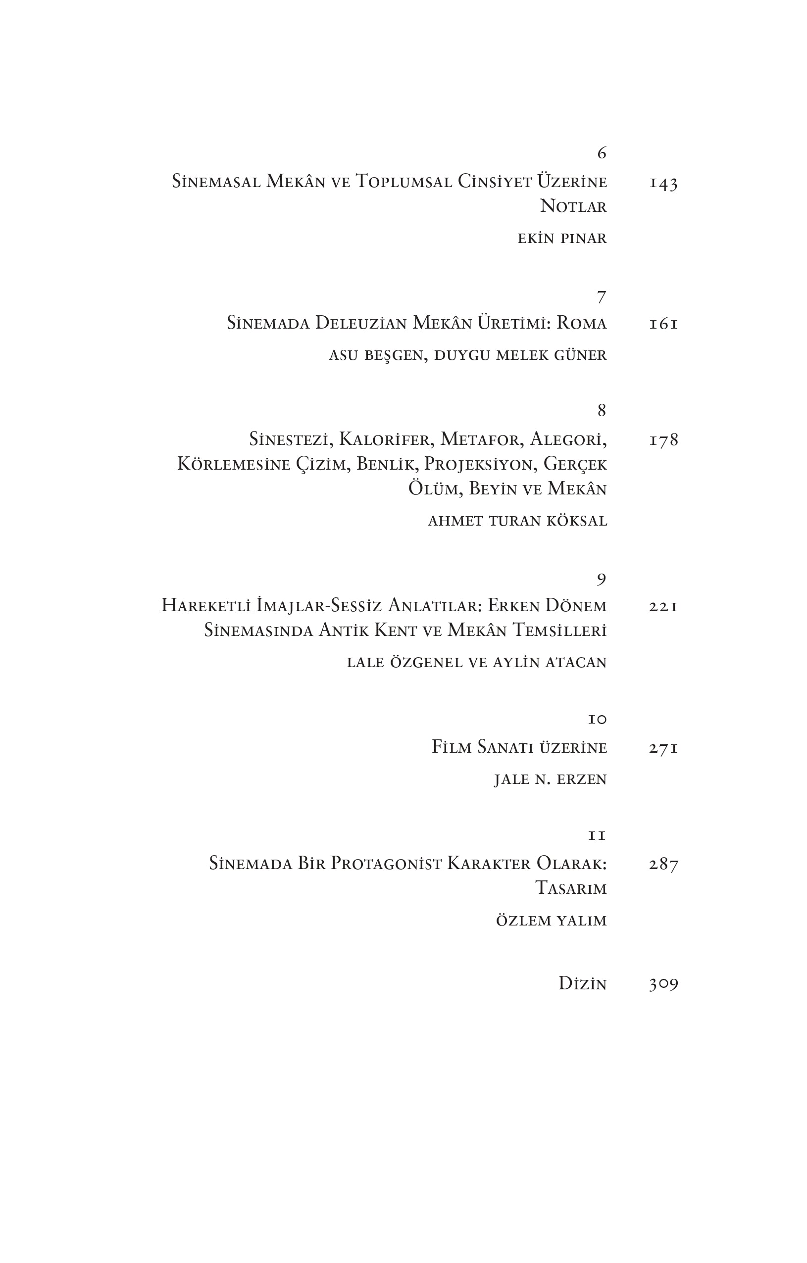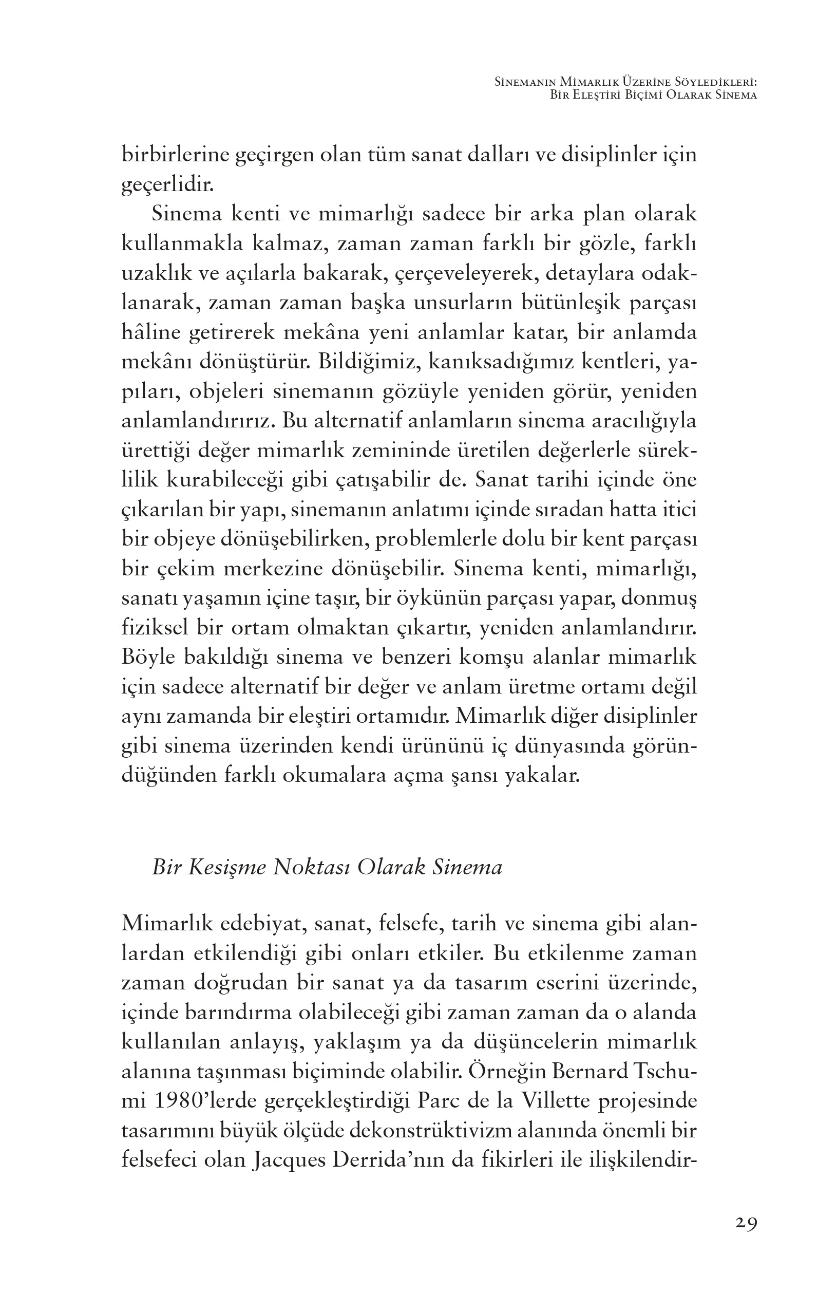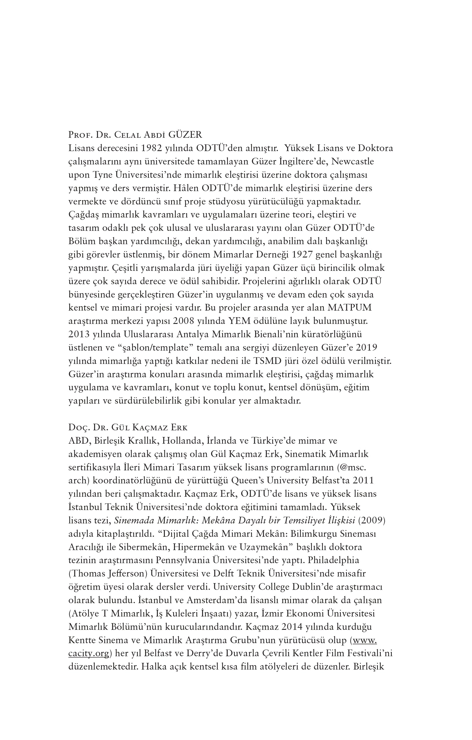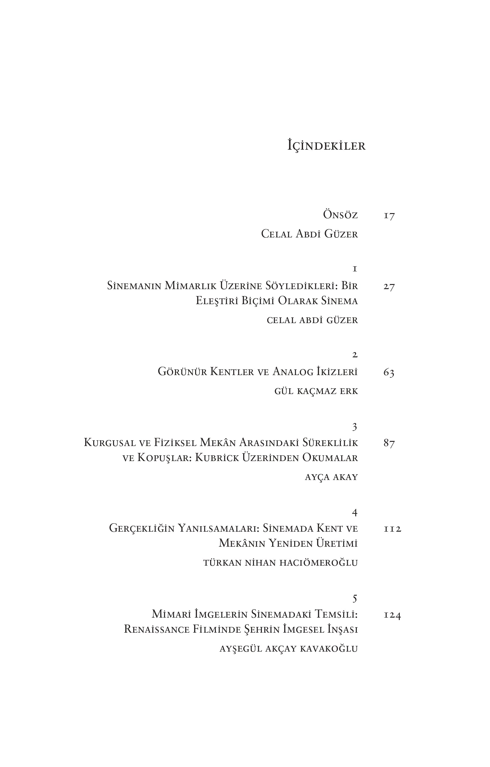 Tanıdık yerleri yabancı, yabancı olduğumuz yerleri tanıdık kılan sinemanın mimariden aldığı gücü analiz eden bu kitap, sinemayı anlamlandırmanın yeni anahtarlarını sunuyor. Celal Abdi Güzer’in derlediği bu çalışmada yer alan değerli yazarlar, hayranlıkla izlediğimiz filmlere farklı bir gözle bakmamıza olanak sağlıyor.