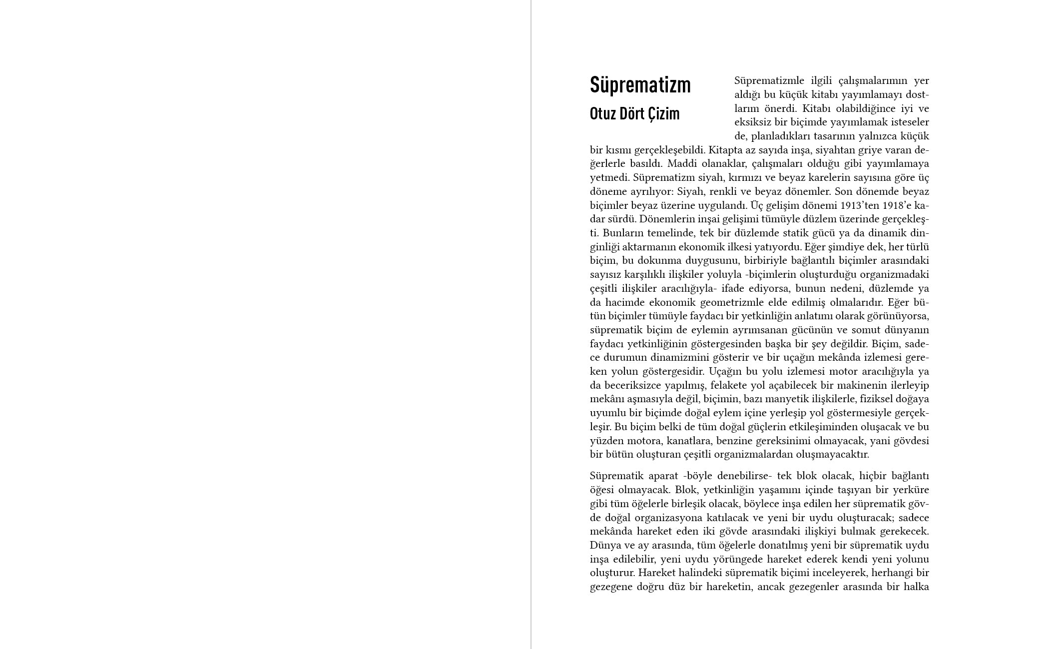 Kazimir Maleviç'in "Süprematizm, Otuz Dört Çizim" başlıklı bu kitabı, 1920 basımıyla aynı boyutlarda, sınırlı sayıda basıldı ve tümü numaralandı.