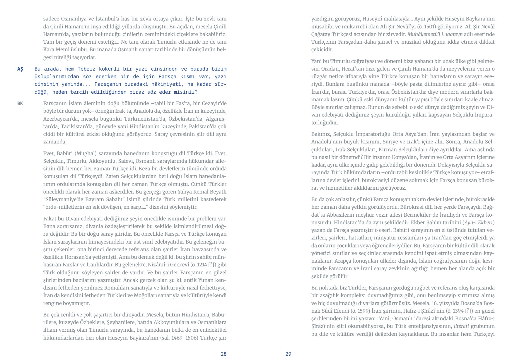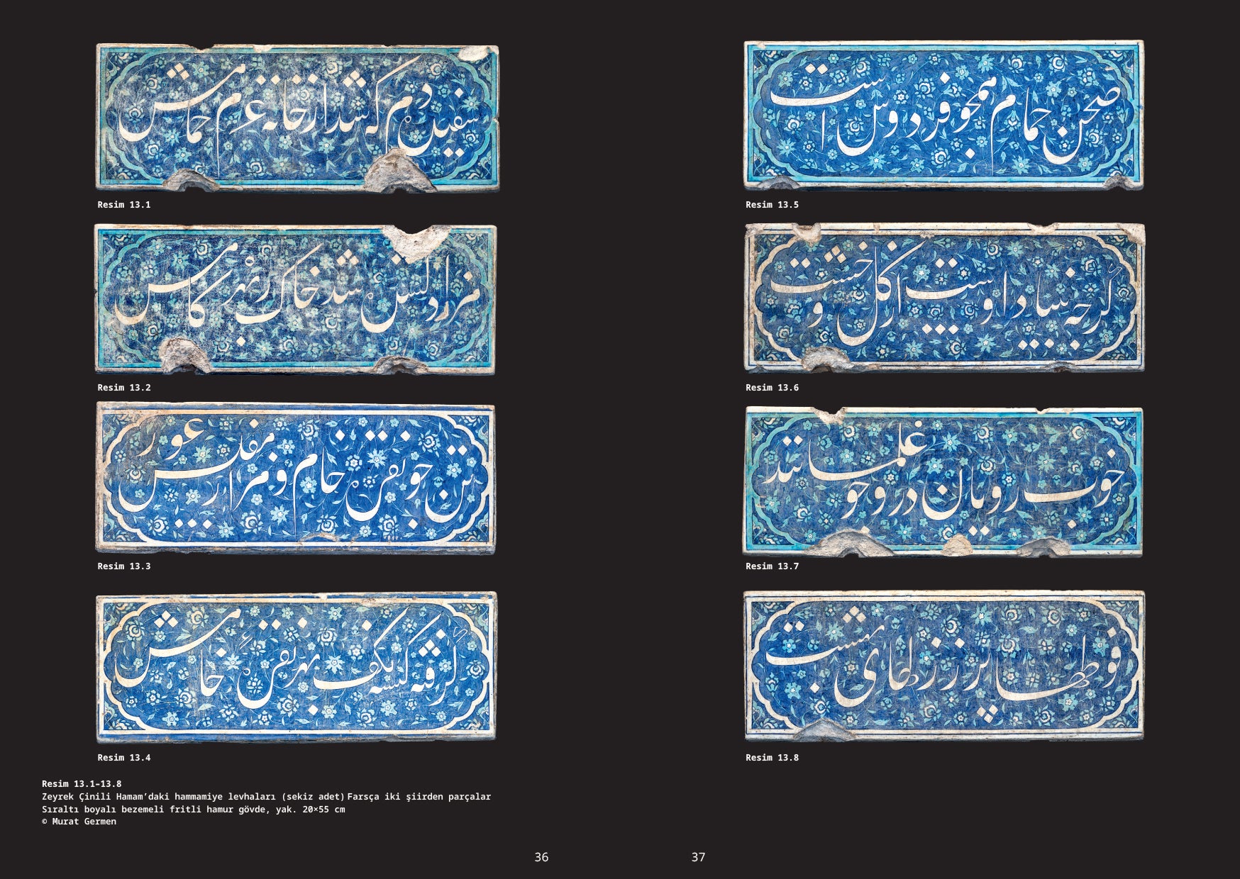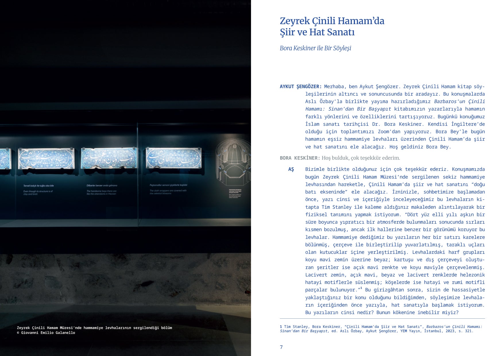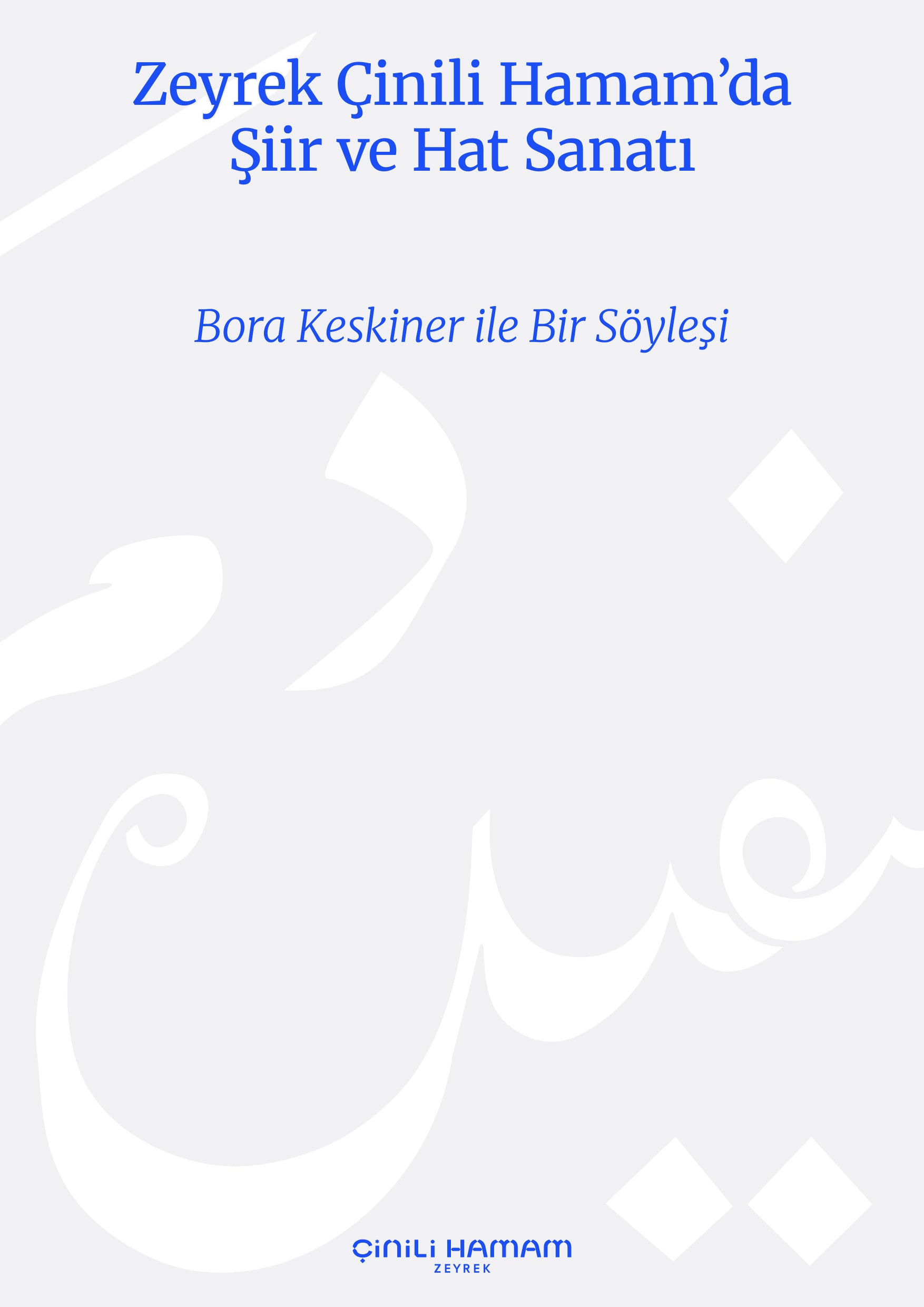 “Zeyrek Çinili Hamam’da Şiir ve Hat Sanatı / Poetry and Calligraphy at Zeyrek Çinili Hamam”, ilk kitabın editörlerinden Aykut Şengözer’in İslam sanatı uzmanı Bora Keskiner’le yaptığı söyleşi geliştirilerek hazırlandı. Kitapta, günümüzde Zeyrek Çinili Hamam Müzesi’nde sergilenen altı eşsiz “hammamiye” levhasındaki şiirlerden hareketle İslam coğrafyasında hat ve şiir sanatının yolculuğu ve özellikle levhalarda kullanılan “nestalik” yazısının İran’dan Osmanlı’ya gelişi ve dönüşümü tartışılıyor. Söyleşinin sonunda ise Farsça şiirlerden yazılmış beyitlerin açıklaması ve yorumu yer alıyor.
